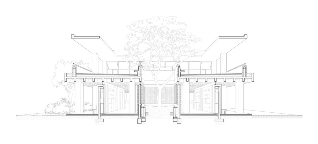 The exhibition building and the classroom units on the south sideThe exhibition building is connected to the classroom units on the north and south sides by corridors