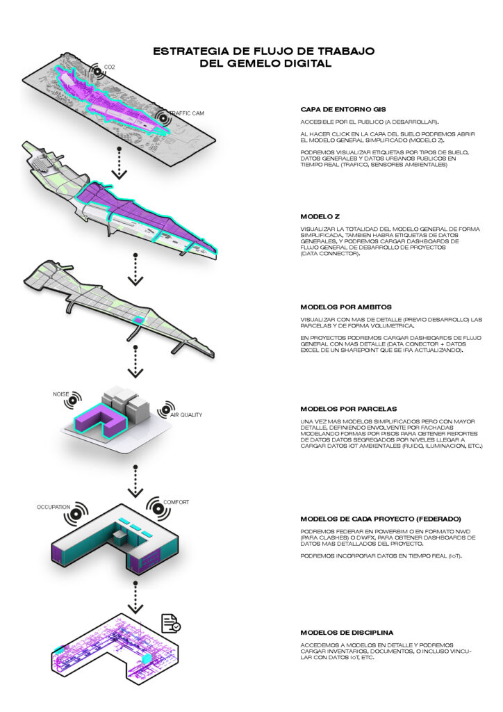 The implementation of a Digitaltwin platform for a project of these characteristics, in where the size of digitalmodels and multiple scales and typologies of developments are integrated, because here infrastructure projects are combined to urban regeneration projects that are surgical, with building and urban projects, public and private are combined. Everything is managed from a master plan that is continually evolving and transforming as projects arise, and here, from minute 1, we have worked to develop a pioneering strategy that consists of applying a multi-scale digital twin system that allows us to address key aspects that we will identify: