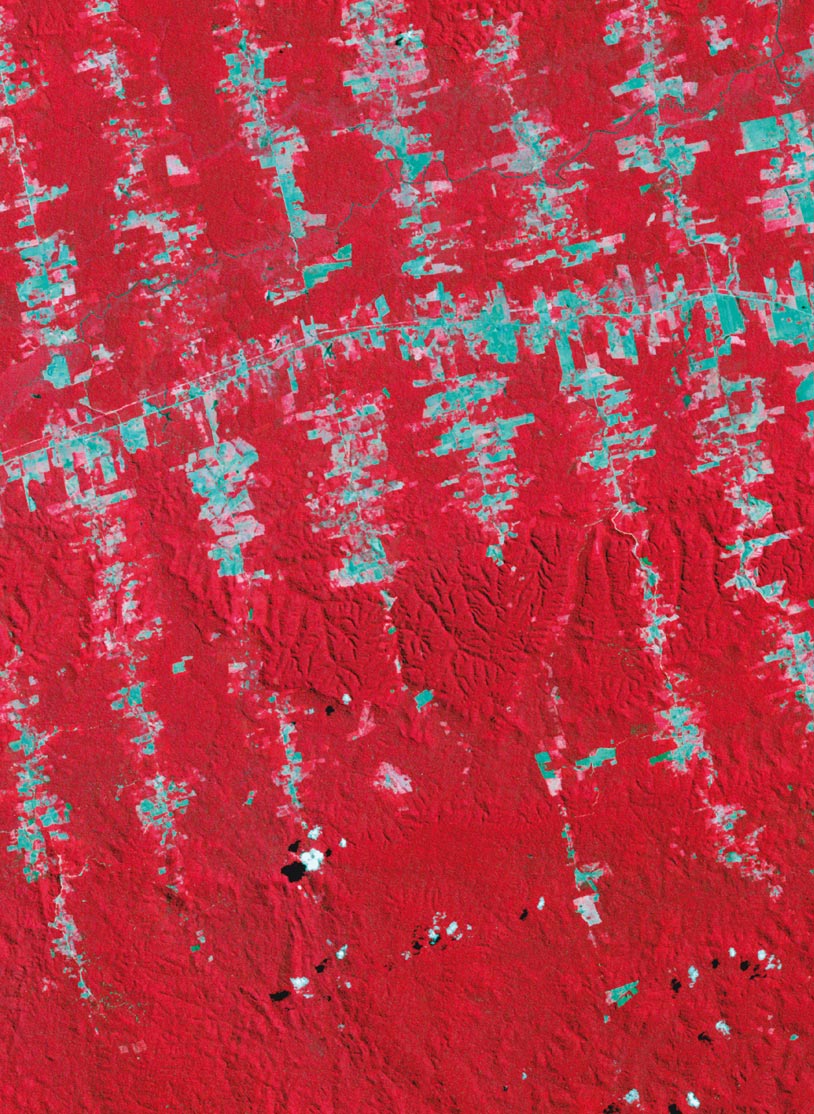 The Amazon is being dramatically deforested in support of global urban-ization. The connectivity infrastruc-tures such as roads that enable the extraction of timber and the cultivation of soy plantations and herding of cattle are creating unprecedented patterns of deforestation, shown here in Pará State in Brazil.