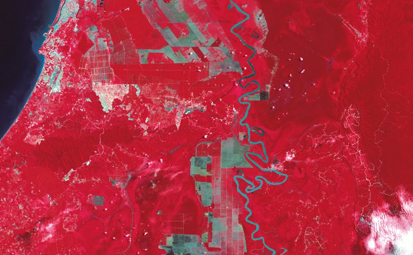 The visual essay proposes a threefold reading. First, a comparative reading of the different sites can be made by scale – all satellite images are at 1:250,000. Second, it allows a juxtaposition of the imprints on the ground with the patterns of urban transformation – from areas of regional specialization to urban agglomeration. Third, the near-infrared images reveal the gradients and arrays of healthy vegetation in contrast with lifeless surfaces.