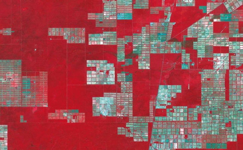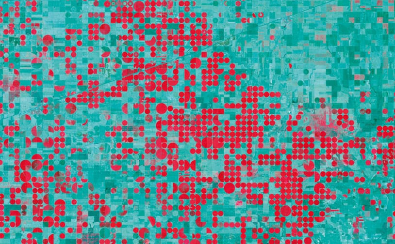 Massive agricultural crops of corn, wheat, and sorghum are grown in Kansas. As in many other areas of the US midwest, this huge center-pivot ir-rigation system enables the operation-alization and intensification of land use in support of meeting food demand.