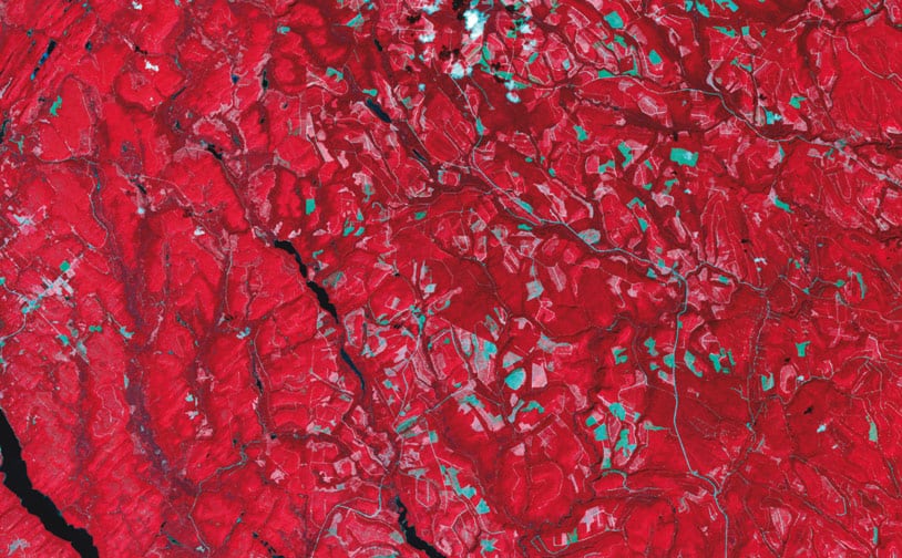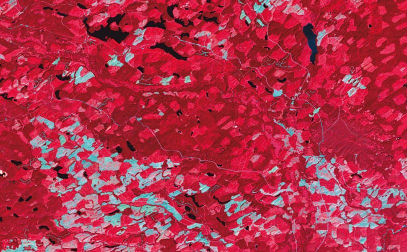 This forest plantation owned by a large timber corporation lies on the border between the US and Canada. In the im-age we see the spruce-fir forest of J.D. Irving, Limited Sawmill Division.