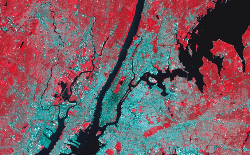 This visual essay of “false color composite” images reveals the patterns of urban transformation across diverse landscapes by looking at the wavelengths and varying in-tensities of visible and near-infrared light reflected by the land surface. When near-infrared light is reflected from the earth’s surface, it provides a value that correlates with the capacity of the land to absorb and synthesize solar en-ergy.