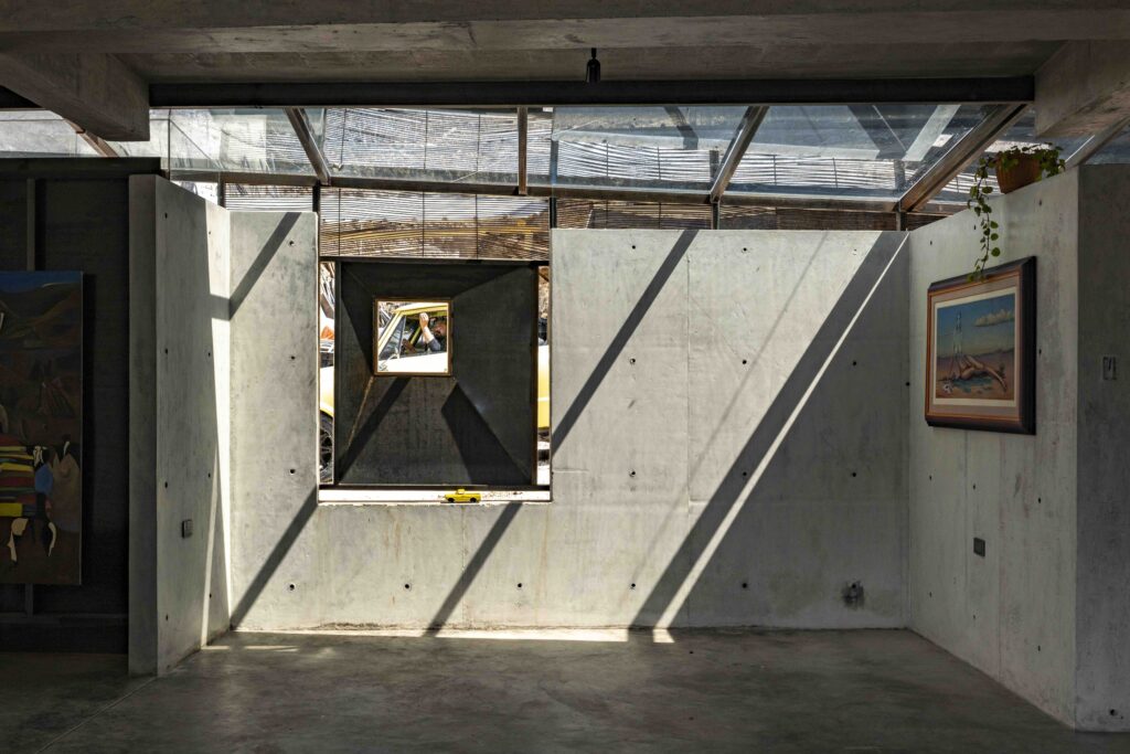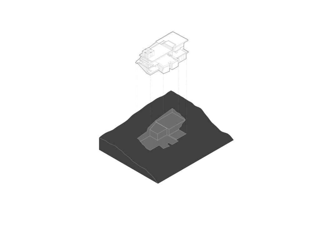 Beneath it, the dwelling fragments into volumes connected by walkways and voids, creating an open system that avoids enclosed masses. The structure, supported by slender pillars and a beam-furniture element, reinforces the tension between the domestic and the structural. This ruin is neither nostalgic nor literal, but a critical condition of dwelling: what remains when we choose not to impose, not to saturate, not to enclose.