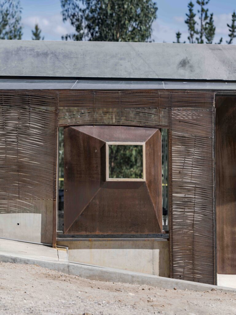 The social terrace, both semi-buried and serving as the roof of the private zone, opens to the landscape in continuity with the topography, while the interior dissolves into the forest without visible boundaries. An elevated greenhouse above the kitchen regulates light and climate, acting as an atmospheric filter at the domestic core.