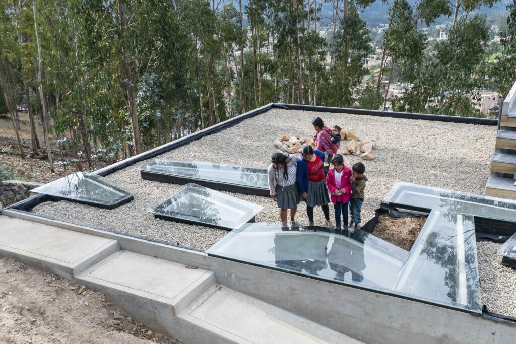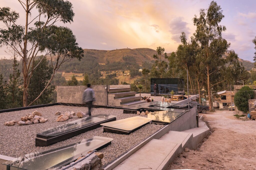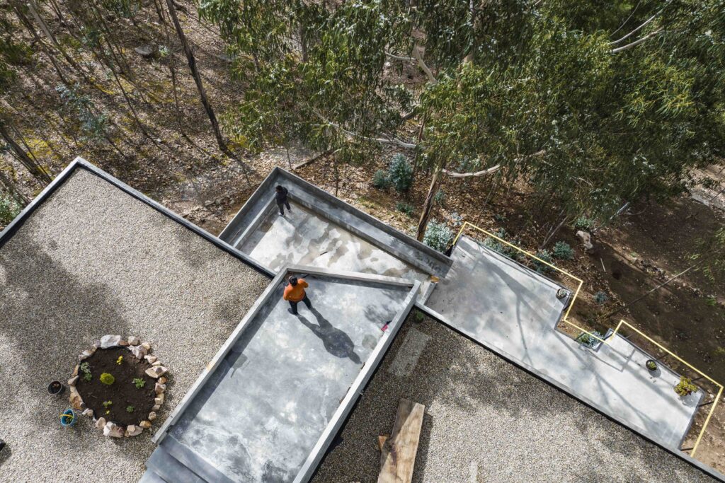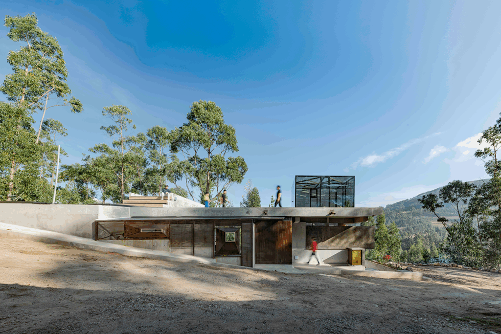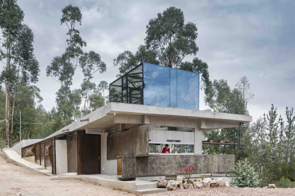 Casa Callacpuma is conceived as an architecture that does not impose itself on the hillside but rather extends it through a suspended garden-roof that functions as park, landscape, and communal articulation. This green surface is not decorative but a topographic restitution strategy that restores continuity to the terrain, visible both from the street and from the architect’s office.