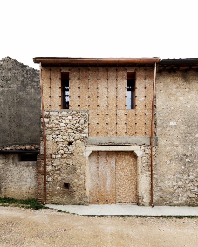 The house embraces a rural aesthetic, enriched by slight imperfections from self-construction, reflecting the region’s rural identity. The north façade is enclosed for insulation and privacy, while the south façade is fully glazed, maximizing natural light. The main façade, built with dry-laid prun stone, inspired from local vernacular architecture (the Lessinia region).