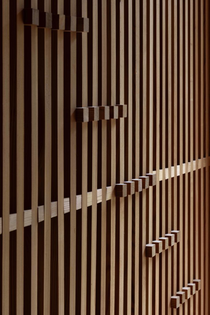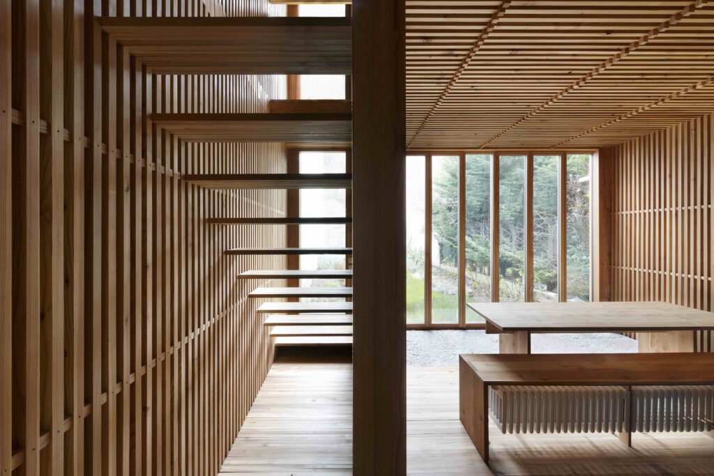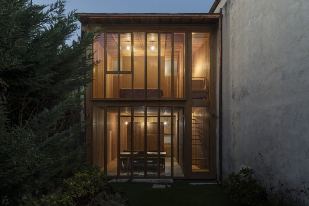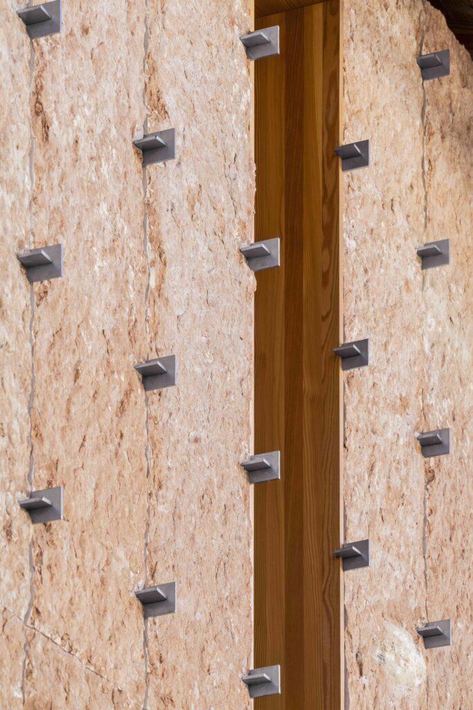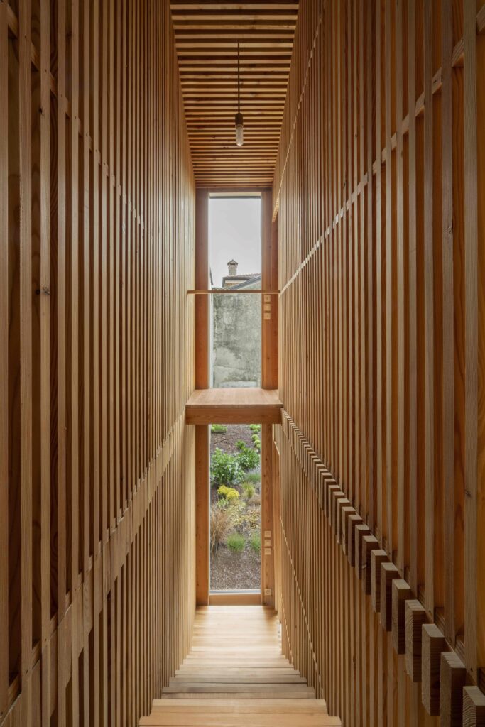 The project explores a construction system based on structural repetition, creating an anti-seismic framework where the wooden structure counteracts the thrust of the stone walls, which in turn brace the timber framework. Structurally, the project explores the limits of wood. The influence area of the floors was minimized, allowing for pillar sections as small as 3×3 cm. Every component of the house follows a 3 cm modular system. The structural elements themselves generate ornament, pushing them to their limit and emphasizing their repetition.