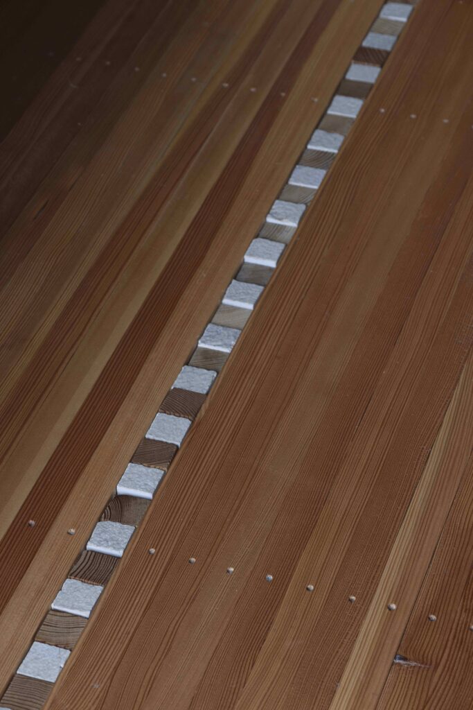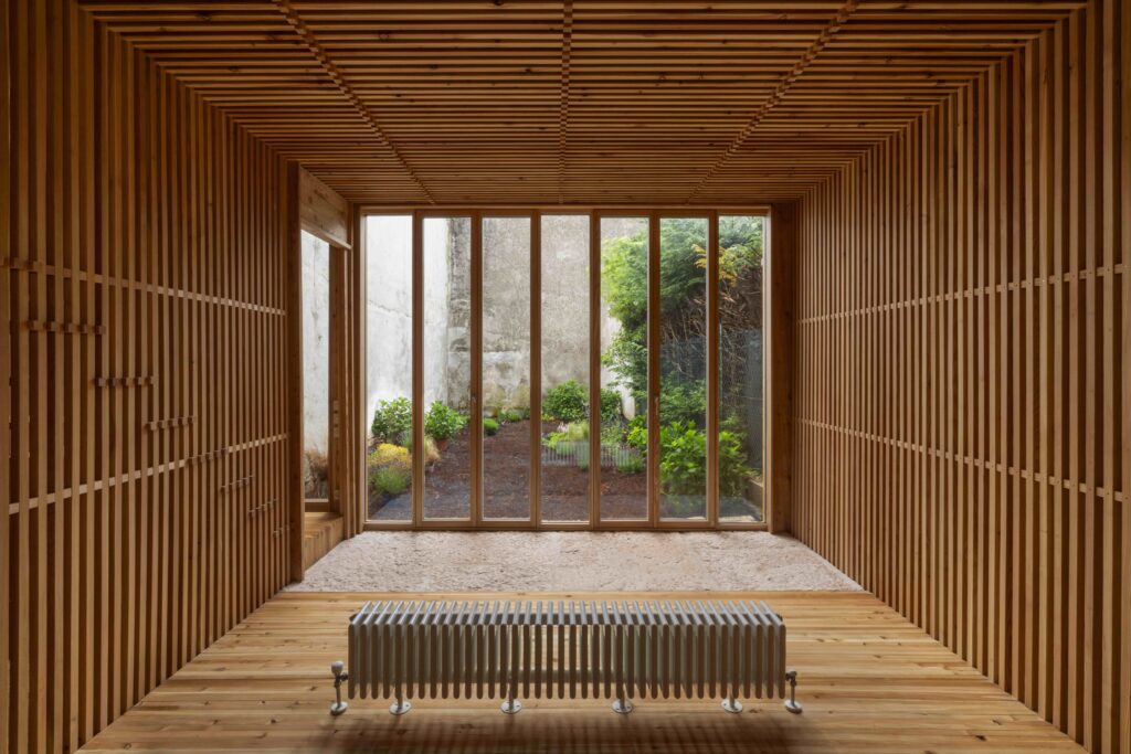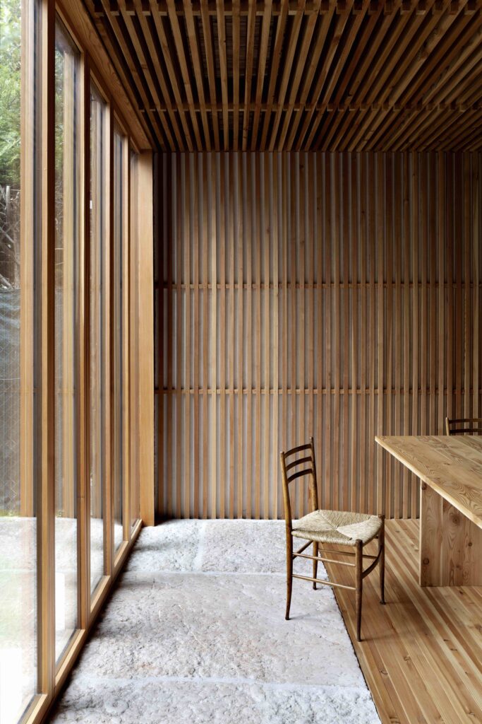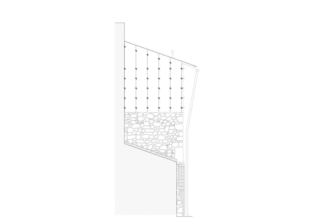 The project explores a construction system based on structural repetition, creating an anti-seismic framework where the wooden structure counteracts the thrust of the stone walls, which in turn brace the timber framework. Structurally, the project explores the limits of wood. The influence area of the floors was minimized, allowing for pillar sections as small as 3×3 cm. Every component of the house follows a 3 cm modular system. The structural elements themselves generate ornament, pushing them to their limit and emphasizing their repetition.