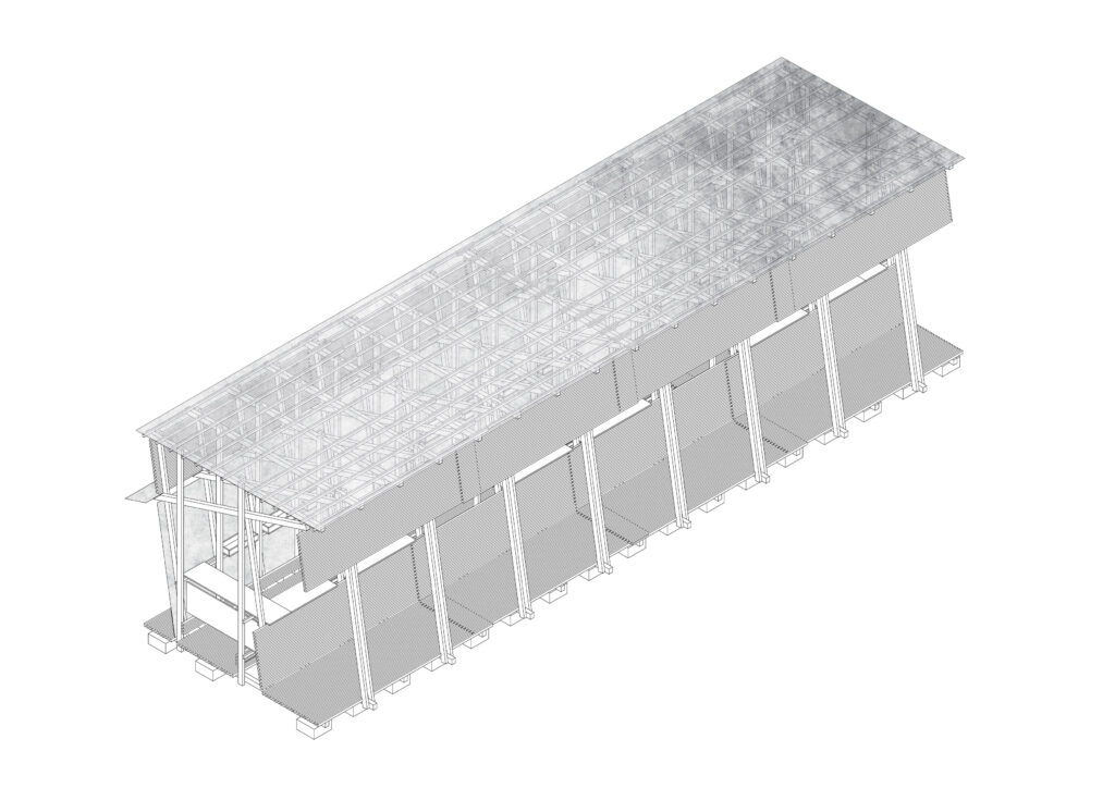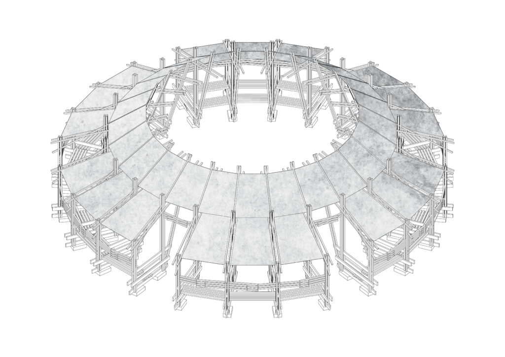The fourteen-meter circular structure is inspired by the aboriginal maloca structures. The dimensions of the elements are calculated according to the full module of the four-meter commercial size in order to avoid waste.