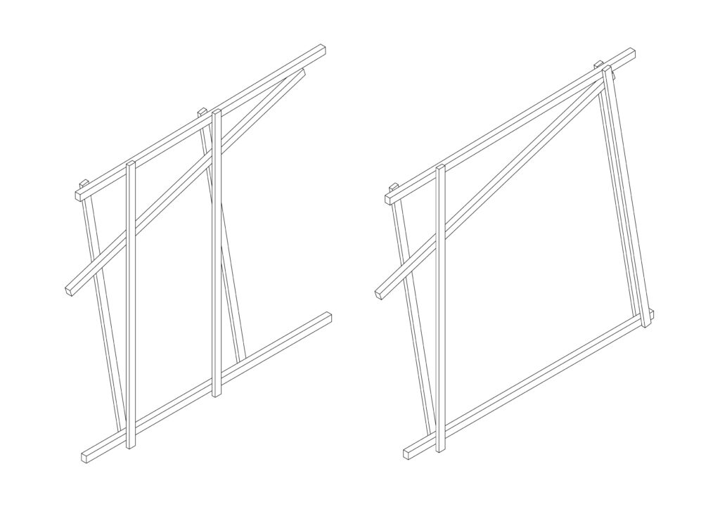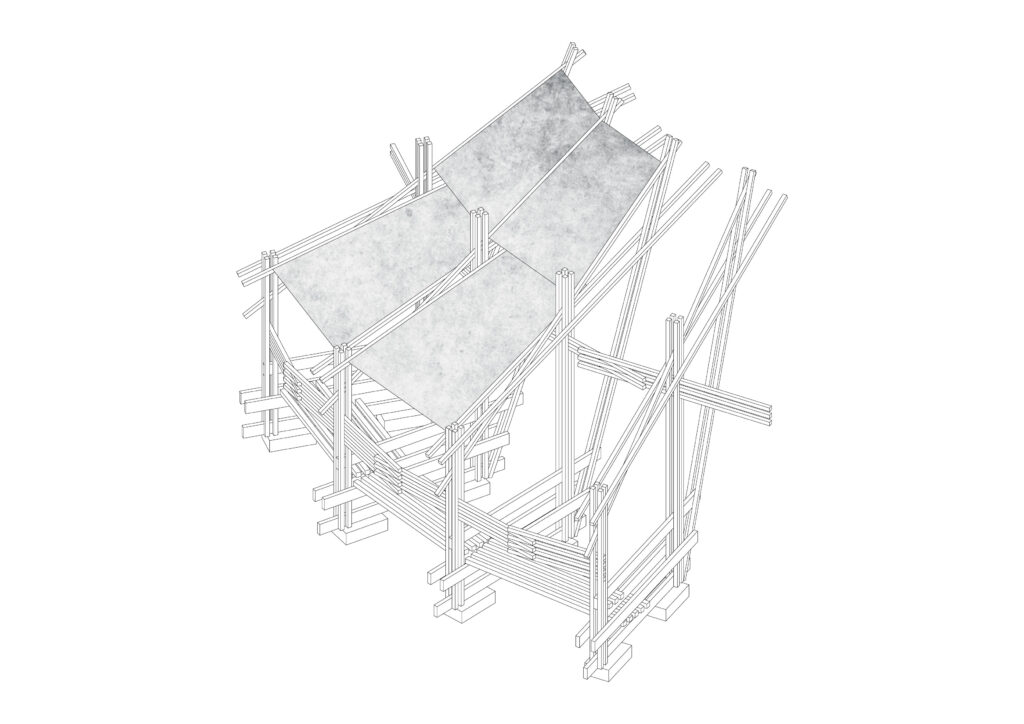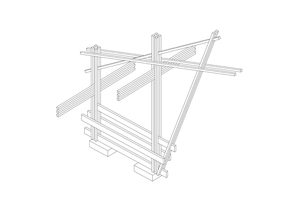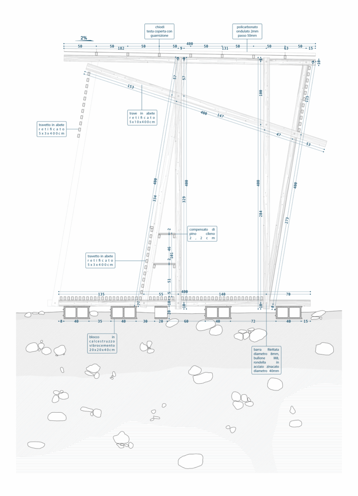 The structure is composed of a modular framework in spruce wood, designed to be built using commercially sized elements without any cutting. The project ensures greater safety during construction and avoids material waste. The structure was built together with a group of students from the Politecnico di Milano.