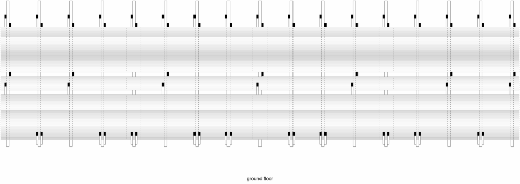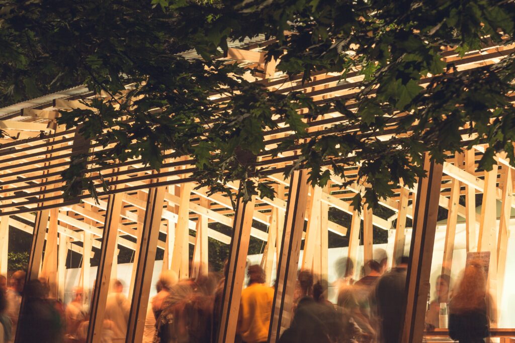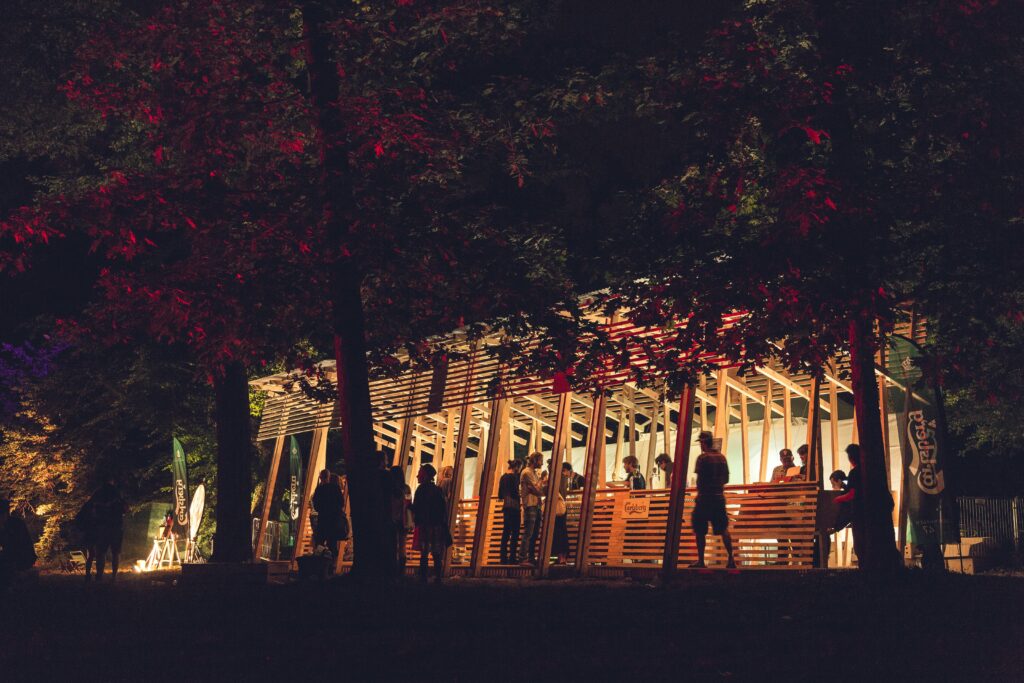 Troppecolonne bar (2014) is a fourteen-meter-long longitudinal structure that hosted the bar for the first edition of the sustainable Terraforma Festival in Milan.