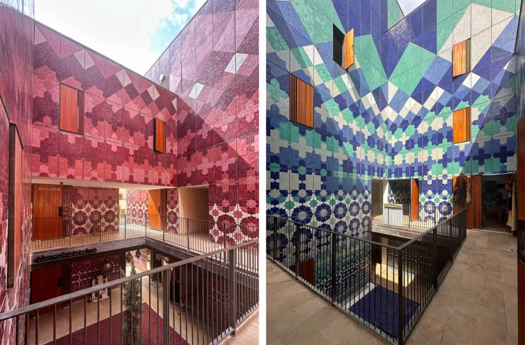 A notable highlight is the vibrant ceramic tilework developed by artist Michael Pinsky in collaboration with Michel Mossessian and local craftsmen. Drawing on Fez’s 1,500-year-old zellige tradition, the tile motifs evolve from classical Moroccan forms to Spanish inflections and contemporary abstractions. These ceramic surfaces not only provide climatic benefits but also serve as intuitive wayfinding elements for the various artisan workshops.