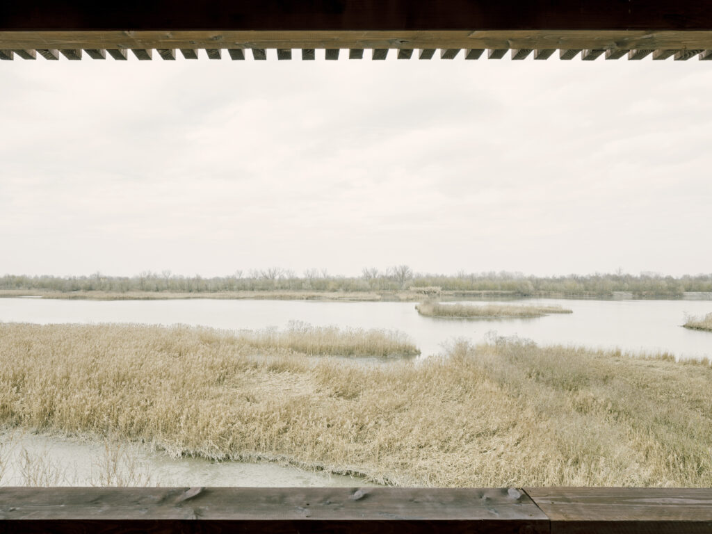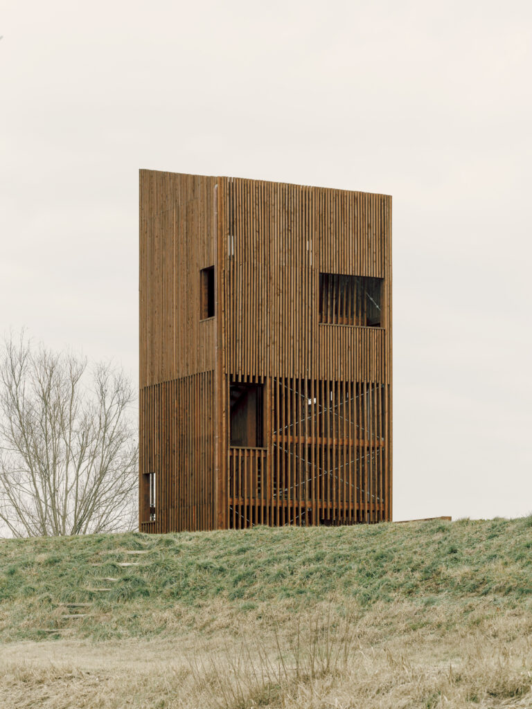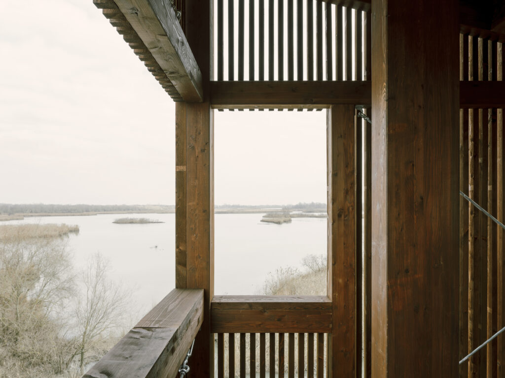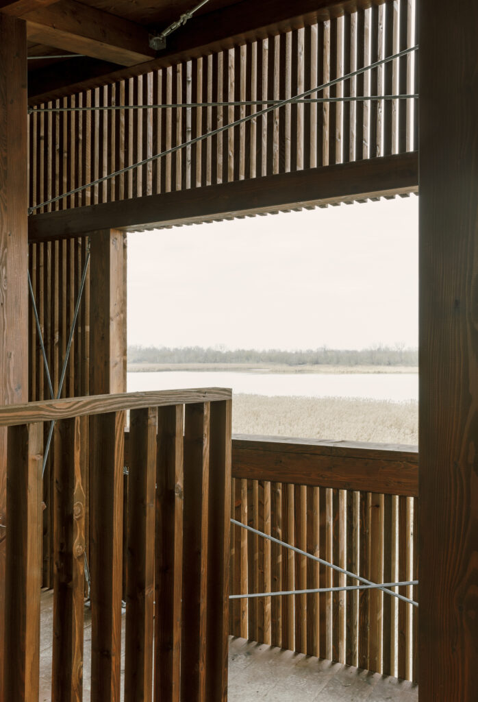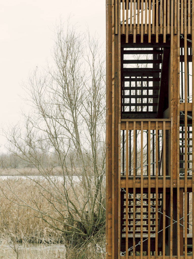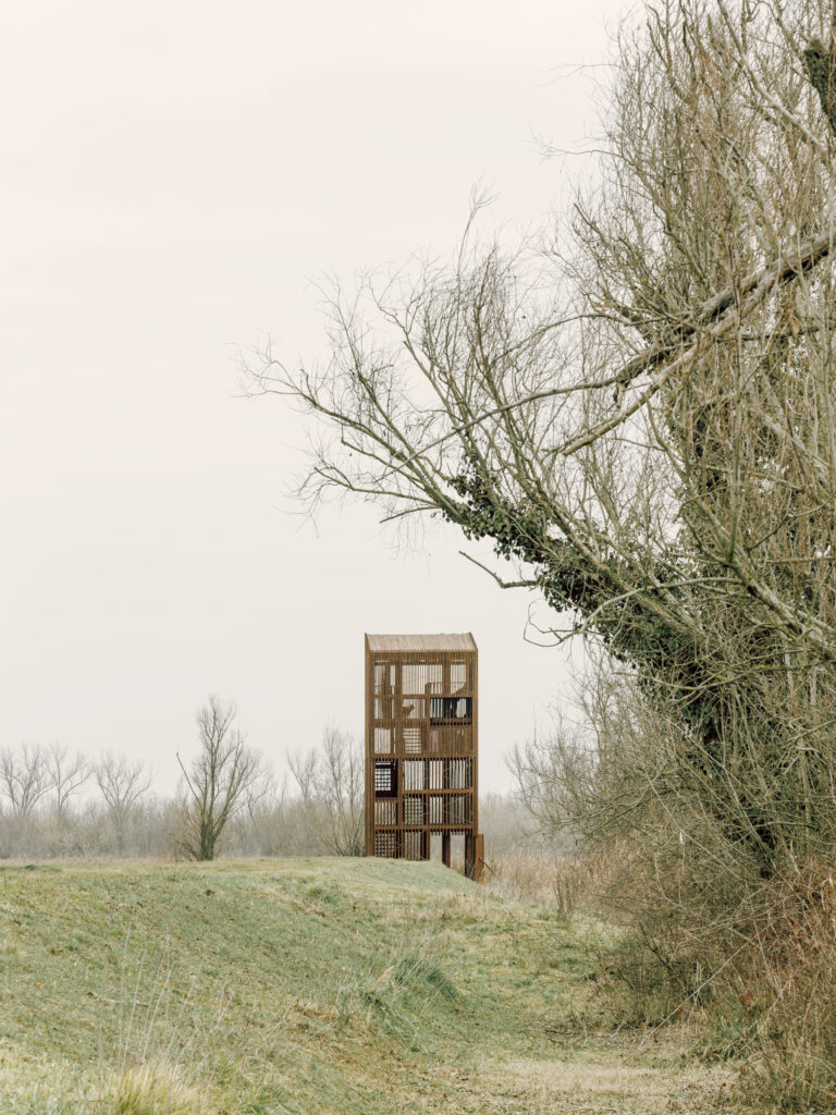 Standing 11 meters tall, it is designed to optimize birdwatching while minimizing visual interference. Organized across multiple half-levels with targeted openings, it offers strategic viewpoints without altering the ecosystem’s balance.