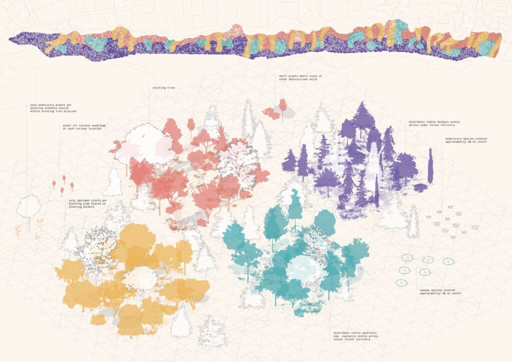 As a leader in advanced computational methods for landscape design, Ruderal developed a parametric planting design tool to reconcile typical planting conditions with precise site-specific spatial data. The tool enables designers to quickly visualize the patches at various scales, adapt and optimize species mixes relative to nursery inventory, and simulate the interaction of diverse species over time. Trees for the project are propagated in Georgian nurseries and sourced from local seed stocks, strengthening the connection to the surrounding ecological context and supporting a growing network of native plant nurseries.