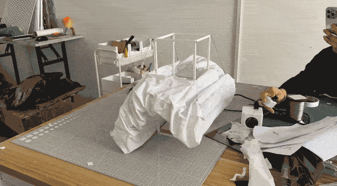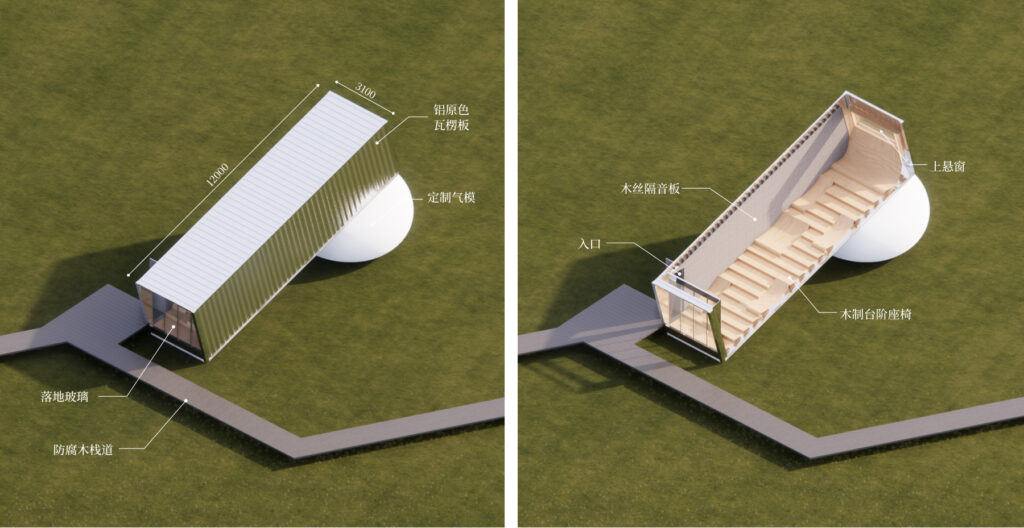 For the cinema and the reading room, since both inflatables are fully rounded spheres, sealed, thickened PVC with seamless welding was used to achieve a smooth, glossy surface. During the 1:2 prototyping of the cinema inflatable, several unexpected issues emerged: the combined weight of the material and air caused noticeable sagging, and it was challenging to ensure the ring-shaped tail closed tightly after inflation. These problems were gradually resolved through multiple rounds of scale adjustments and fabrication refinements with the manufacturer.
