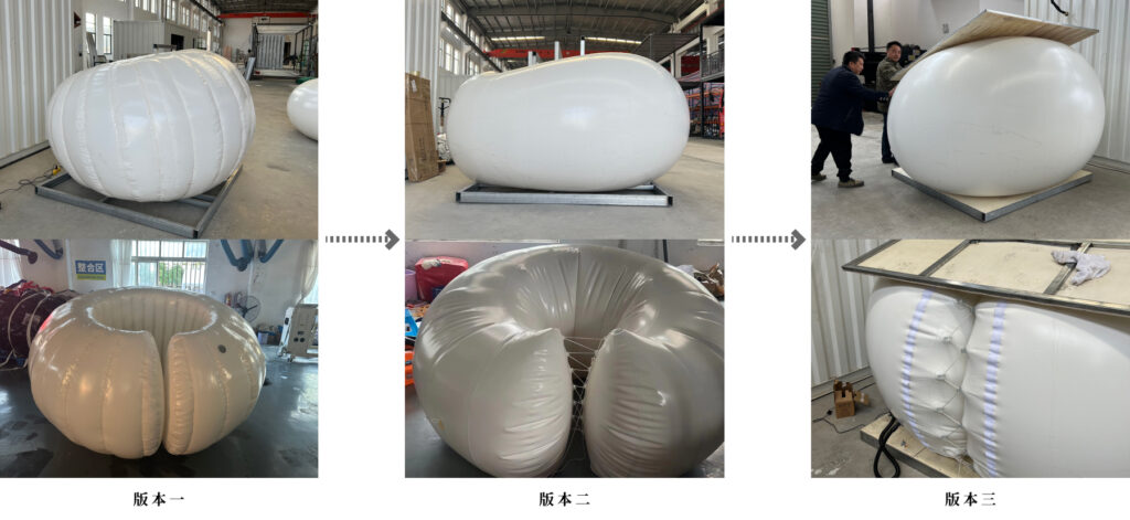 From the initial 1:20 handmade model to the 1:4 inflatable prototype at the factory, and finally the full-scale 1:1 construction, the process not only tested the feasibility of inflating at such a large scale, but also served as repeated rehearsals of the on-site assembly sequence—an essential consideration in design for procurement-based projects.