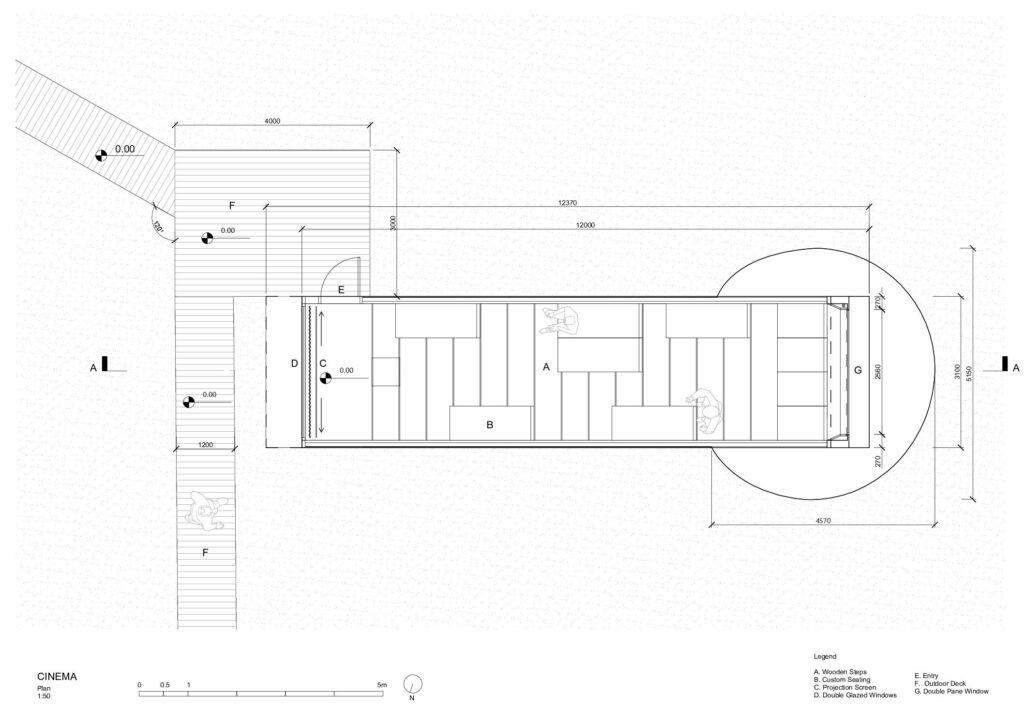 The screening room covers just over 30 square meters—small, but fully equipped. The project integrates the screen, projector, speakers, air conditioning, and other systems into the design. Wood wool panels serve both as acoustic treatment and as decorative finishes for the walls and ceiling. On the floor beyond the standard wooden steps, curved backrests were custom designed with ergonomic forms, shaped to fit the body, allowing visitors to recline comfortably. This detail aligns perfectly with the laid-back spirit of the “Leaning Cinema.”