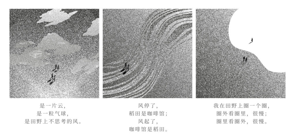 Dun’ao Village (墩岙村) is nestled inland among low hills in Sizhoutou Town, known for it’s coastal scenery. The term “岙 (ào)” embodies the notion of a small valley enclosed by mountains. At the conception of the project, the team believed it was important to capture the sense of serenity and peace among the farmlands surrounded by hills. Instead of typical architectural frameworks, the project sought to express these sentiments through a series of short poems and illustrations. This abstract and reductive approach prompted a reconsideration of the relationship between the body and nature, revealing the potential for it to be lighthearted and playful in nature.