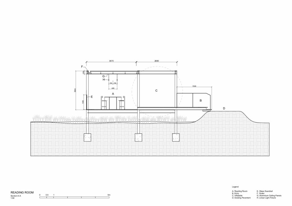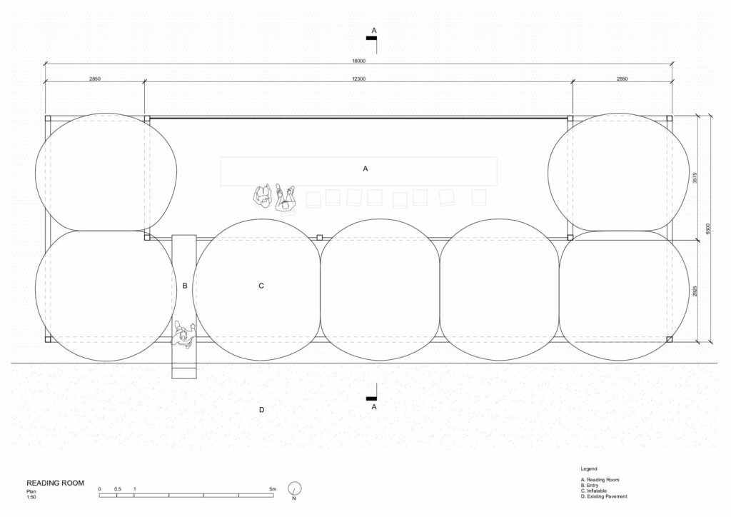 The reading room is a semi-outdoor space, where the metallic materials—aluminum panel ceiling, stainless steel desks, and gridded floor panels—contrast strikingly with the inflatable’s smooth, white, and rounded form, creating a blend of cool austerity and playful softness. In hot weather, the spheres become especially plump and taut due to the higher temperature. Bright sunlight from the south side, once filtered, enters beneath the roof and, together with the semi-reflective ceiling surface, creates a unique shadow effect.
