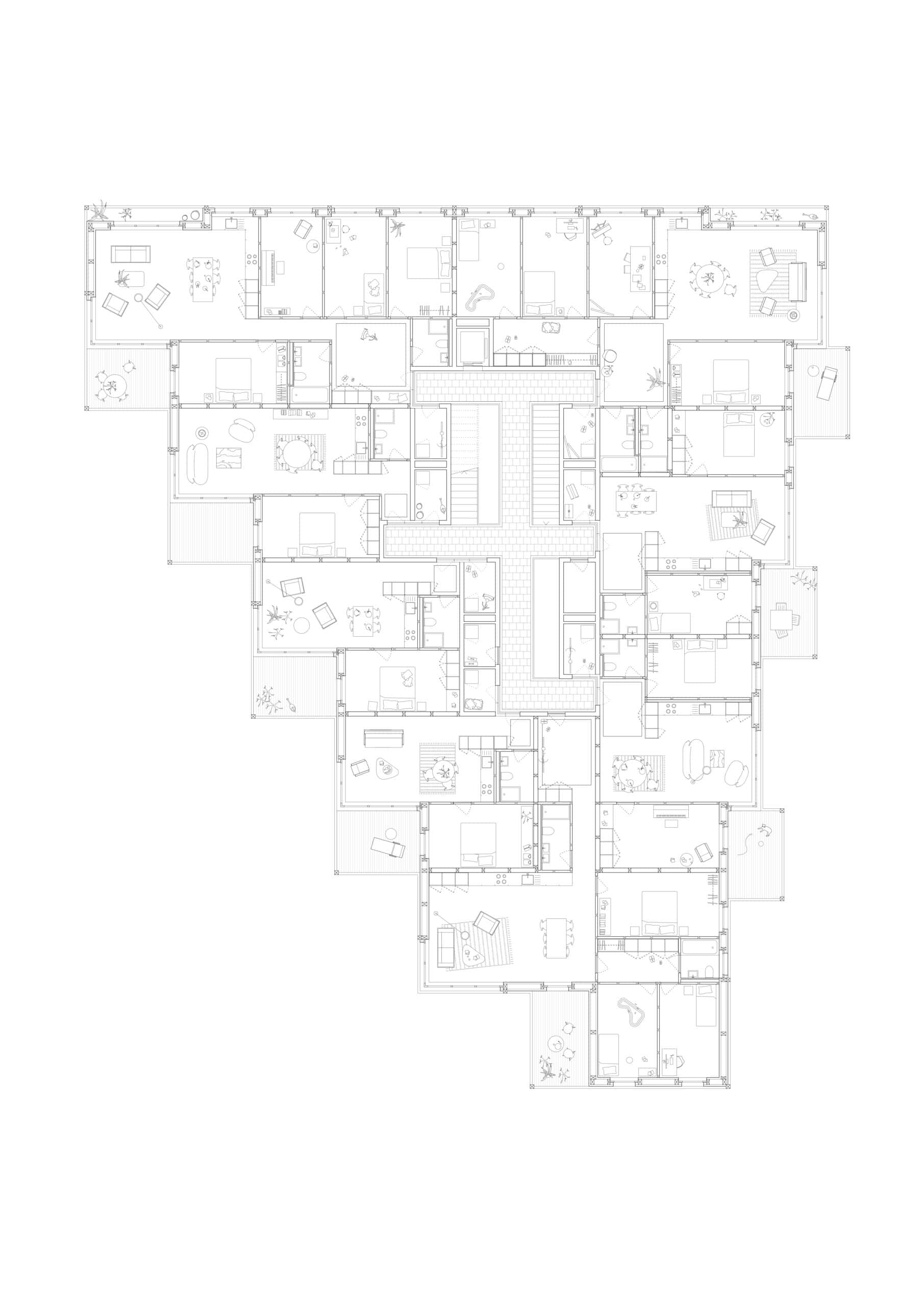 Arcaded ground floors in the new buildings, along with the Salzmagazin’s generous cantilevered canopy, establish semi-public spaces that activate the courtyard and integrate ground-level commercial units. A café housed in the Salzmagazin has become a vibrant social hub for local residents. Behind the ensemble, the repurposed former horse stable now serves as a spacious bicycle storage area, supporting Lucerne’s pioneering car-free housing initiative. All residential units are located in the newly constructed buildings and offer a variety of typologies and sizes, promoting social diversity. The majority of apartments face south, ensuring ample natural light and unobstructed views over the Allmend towards the Pilatus, reinforcing the relationship between built form and surrounding landscape.