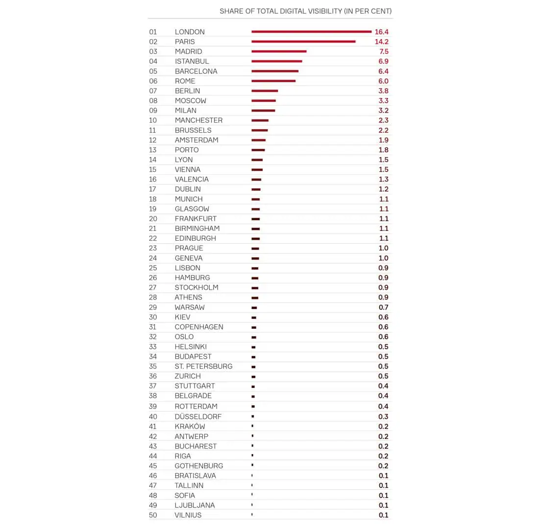 – London and Paris share almost a third of the online conversation for the Top 50 cities. However, both cities have seen a reduction in visibility since the 2019 edition.
