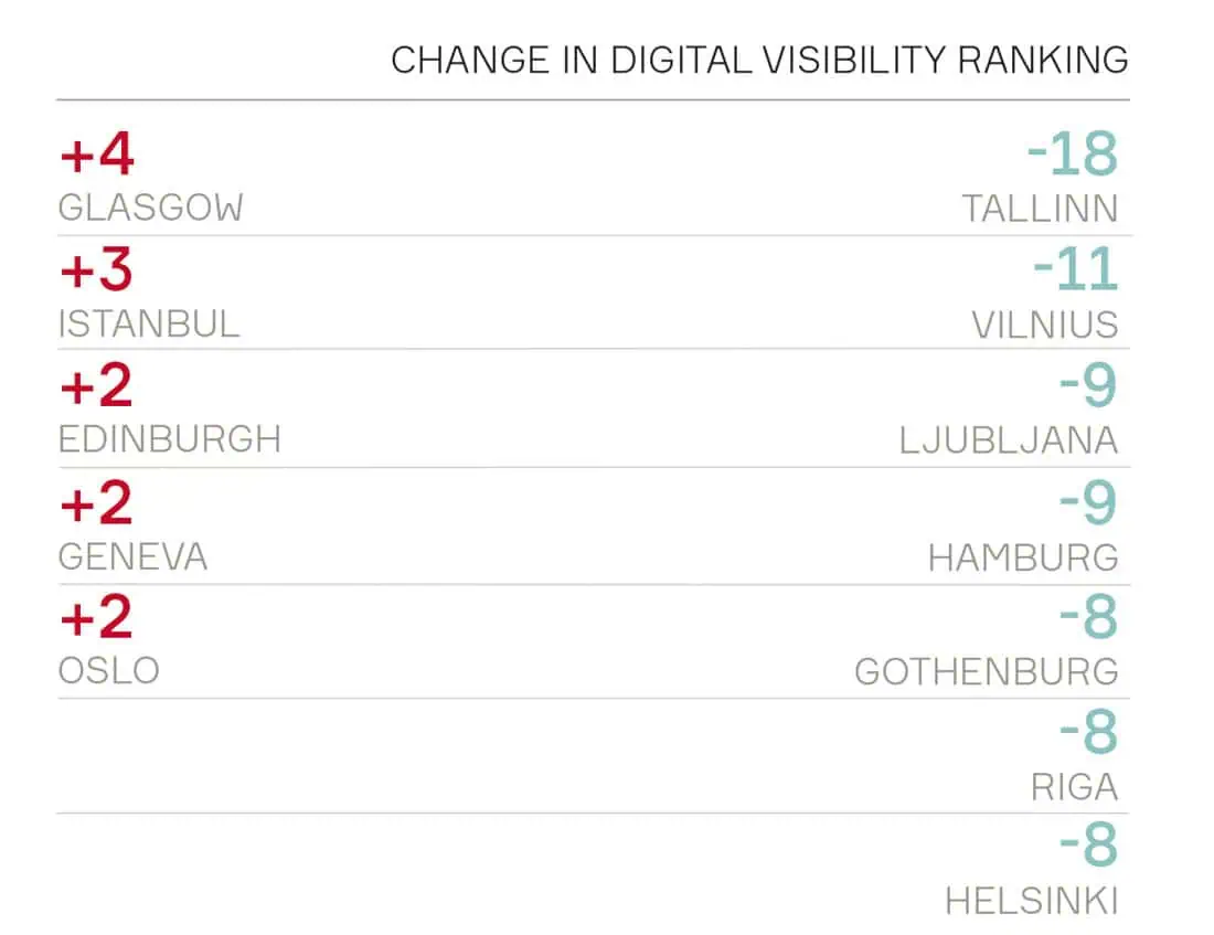 Oslo, which has gained digital visibility over last year’s ranking, has also seen a reduction in its visibility score across global city rankings, leading to a closer alignment between the two.
