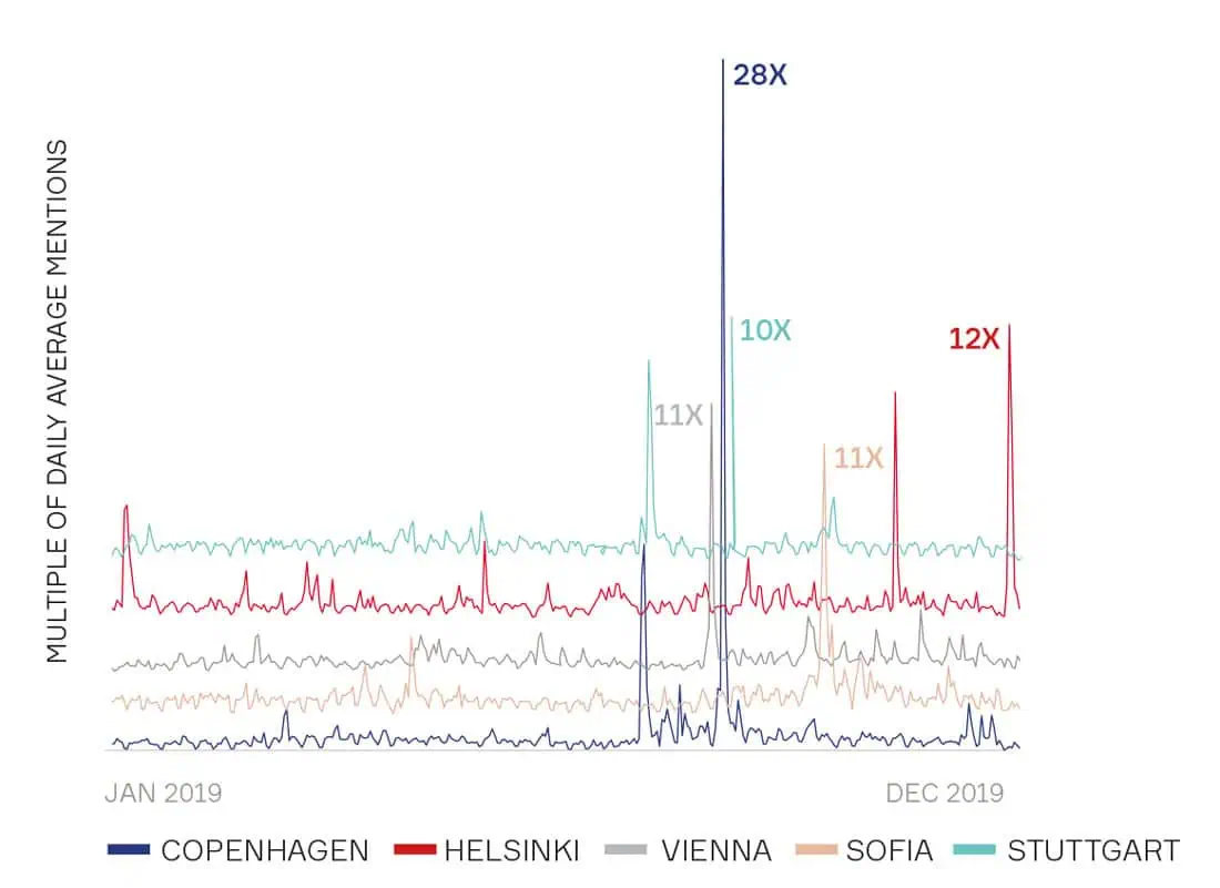 – Copenhagen, Helsinki, Amsterdam, Milan, Berlin and Vienna trended after digital mentions linked to Korean boy bands went viral. A Canadian band led to similar spikes in Kraków, Antwerp, Zurich and Stockholm.
