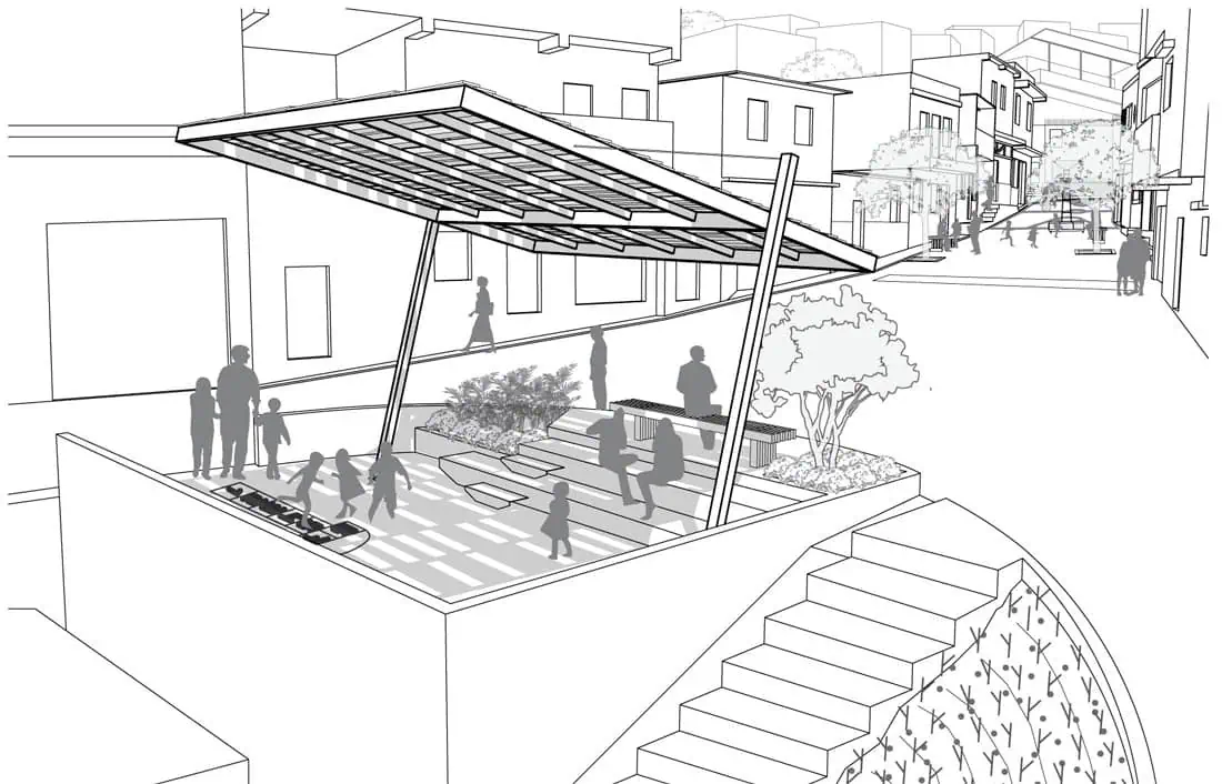 Fig 2. View of the public space Project Plaza Santa Rita in La Ceiba, Barrio Unión, Petare Sur. The project was part of the program City Planting – Fudep, designed by Enlace Arquitectura 2017.