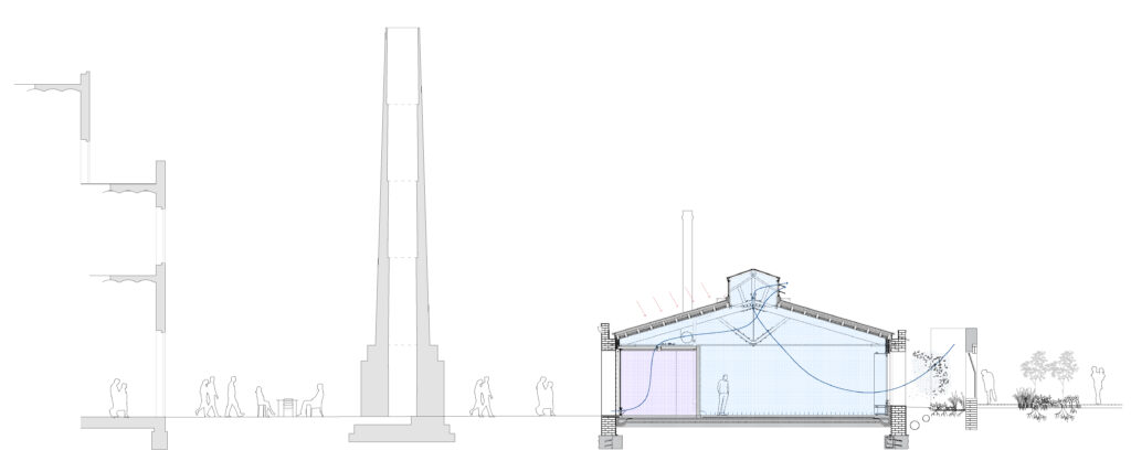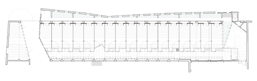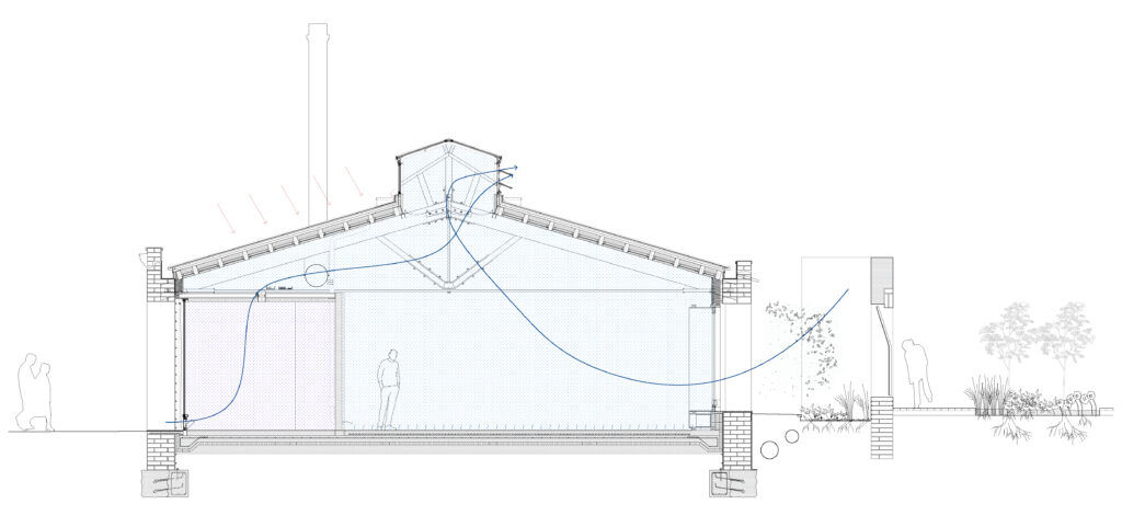 At the heart of the intervention is an oversized internal corridor—an unconditioned, shared space housing utilities like sinks, toilets, benches, and vegetation. A reflective, thermally-insulated ceiling reinforces its passive climate strategy, functioning as a buffer zone. Climate responsiveness is further articulated in a concrete wall designed to retain thermal inertia and radiate heat.