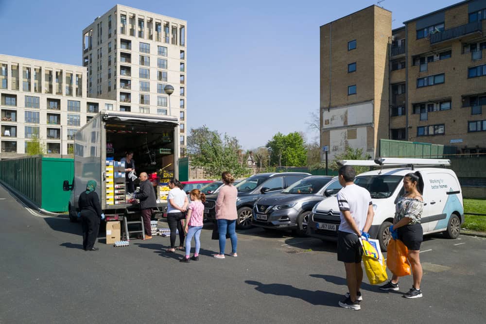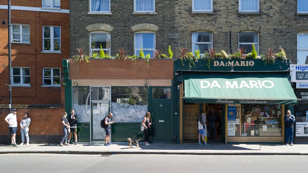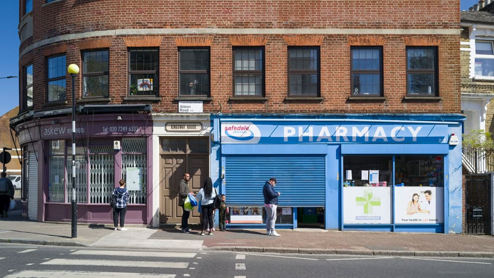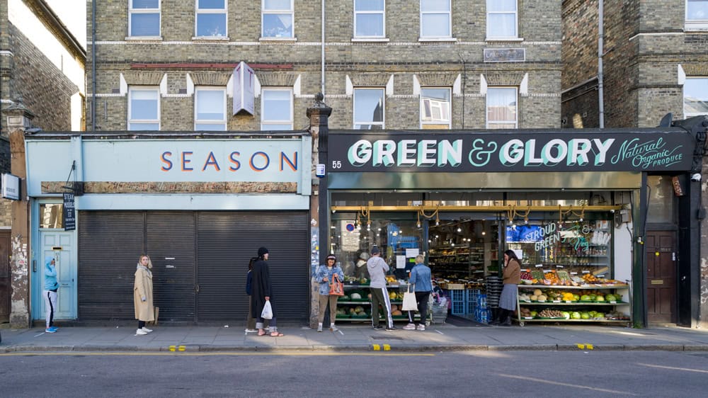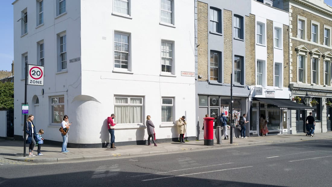 During lockdown, with the empty streets, the queues became a unique signifier in the cityscape. With the two metre gap between everyone, the lines were growing even longer at local groceries, diy shops, post offices, pharmacies and supermarket which I’ve been photographing in my neighborhood in North London. In one instance (Godfrey-Bournes_COVID19) there are actually two queues intersecting, one for the butcher the other for the fishmonger.