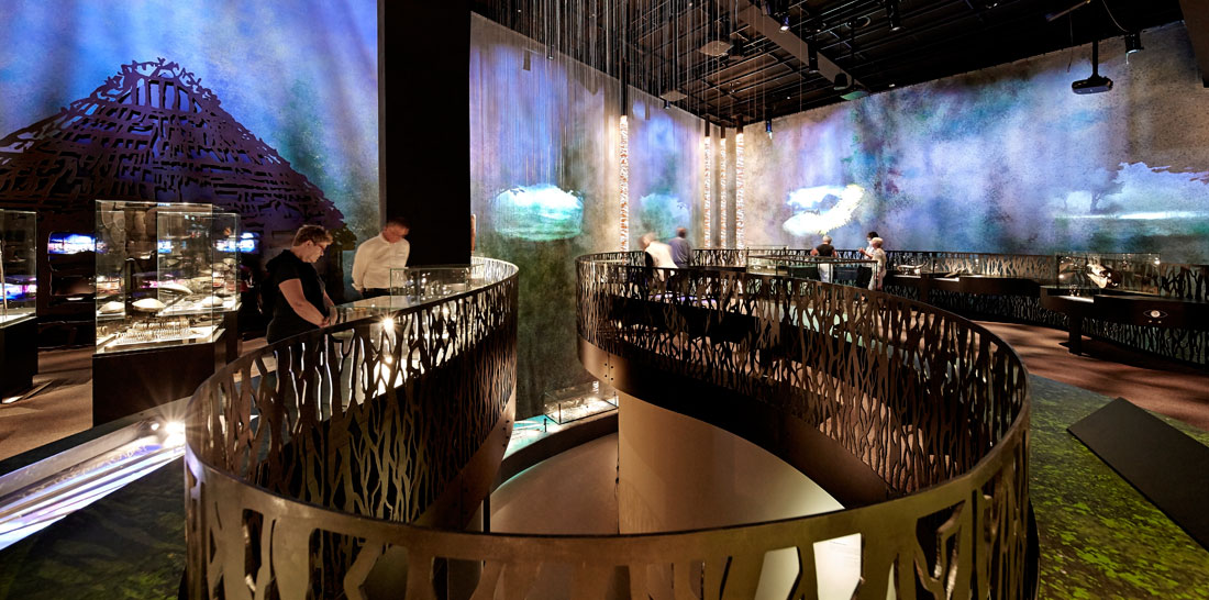 Everything in the exhibition is new. Burial mounds and districts of towns, faces and people have been reconstructed and built for the new museum. The exhibition is the biggest in the museum and with a floor-to-ceiling hight of 12 meters it is possible to communicate the impressive collection of Moesgård on several levels. Thus the exhibition reflects the archaeological excavations which gradually unearth the layers of the history.