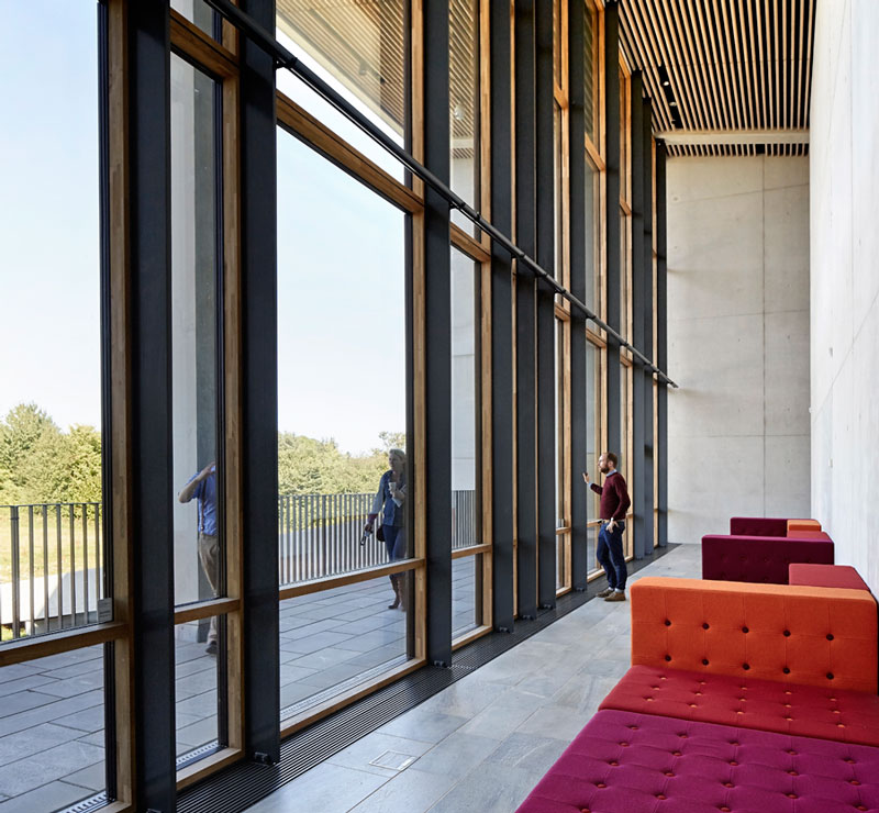 The roof slopes downwards to the south, protecting the objects on display from direct sunlight. Connected to each exhibition room, a glass-enclosed area functions as a break room – allowing visitors to enter, but preventing direct sunlight from reaching the objects on display. In these spaces, visitors can have a bright respite from the dark of the exhibition spaces and reorient to nature and sunlight.