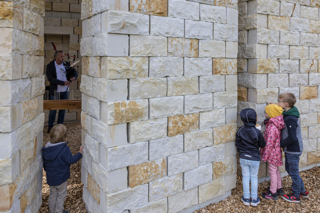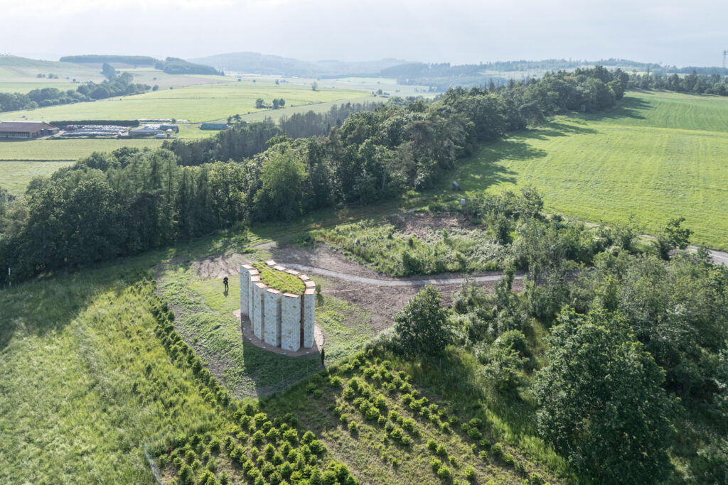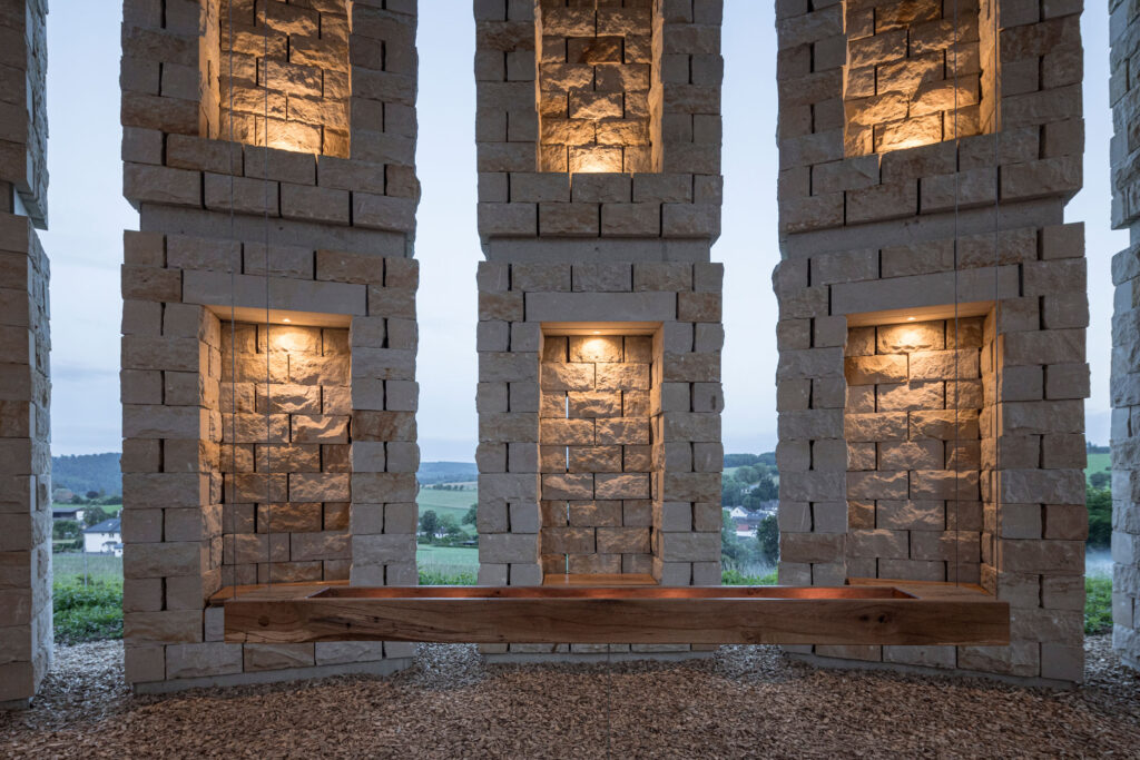 Perched on a hill, the chapel features twelve 6-meter-tall sandstone pillars that define an open space, with its interior resembling two protective hands. The positioning of the pillars provides panoramic views of the surrounding landscape, further reinforcing the connection between the sacred space and its natural environment.