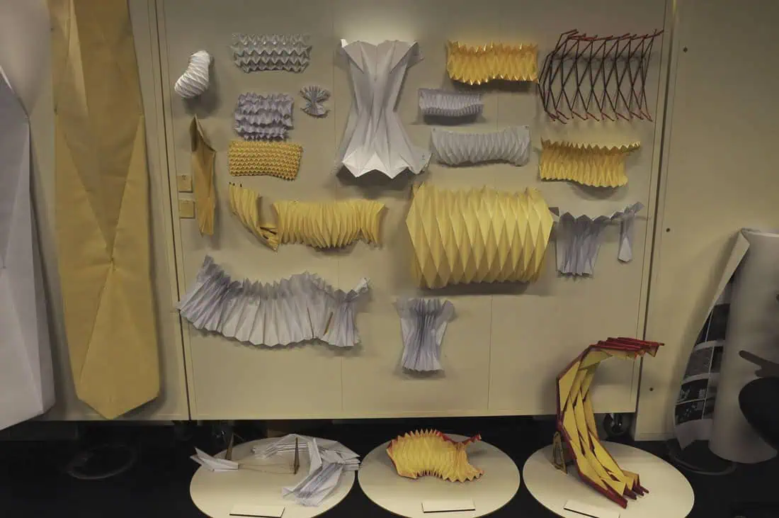 Using folded paper as a way to investigate patterns is useful as it is clear when the pattern strengthened the paper or when it makes the paper weaker. These explorations also tested aesthetics, spatial potential and how the folds would stop, either at ground or at ceiling. When scaling up, material limitations were considered, not only the limitations of the size of the fabric or sheet material but also its thickness. As the paper samples increased in size so too did the thickness of the material. This was necessary because material and technique are linked, i.e.: if the paper is too thick the pattern becomes obsolete as the inherent strength of the paper takes over and vice versa, if the paper is too thin the folding remains only decorative.