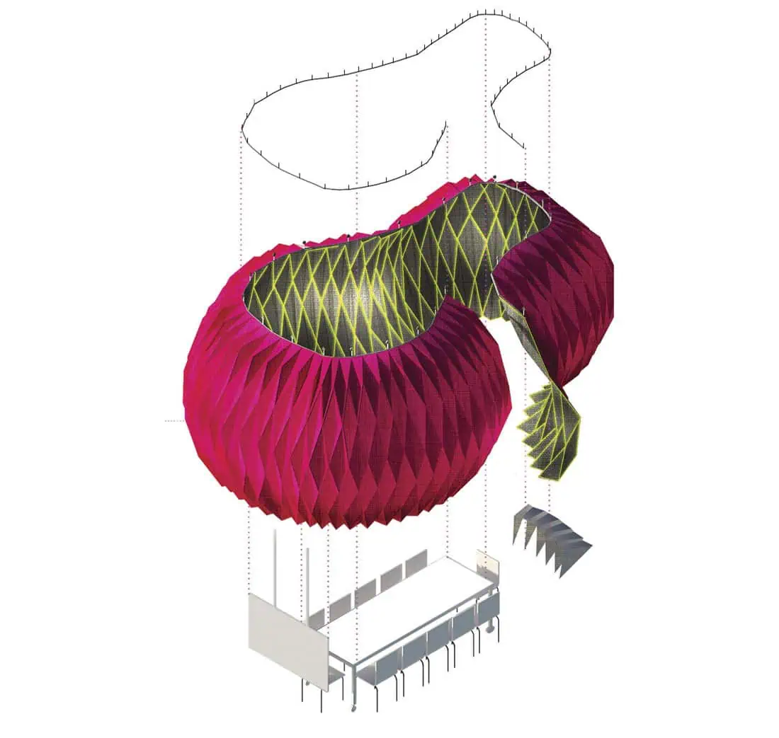 Exploded Axonometric showing the curtain track and pleated fabric of the KnitPav