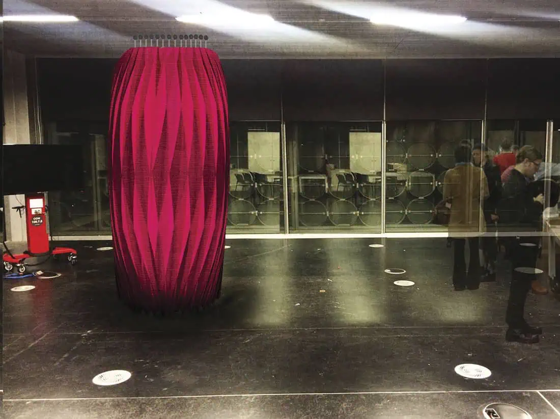 Initially the PleatPod was called the KnitPav (knitted pavilion) and was envisioned as a structured curtain that would hang from a track embedded in the ceiling. Users would be able to wrap the curtain around an interior meeting space when needed and then pack it away, and this flexibility would allow the curtain to take on many configurations. This was a direct response to the brief for a solution to open plan offices that require privacy for meetings. Where the Glow project had tensioned tubes, the KnitPav worked with gravity to create pleats.
