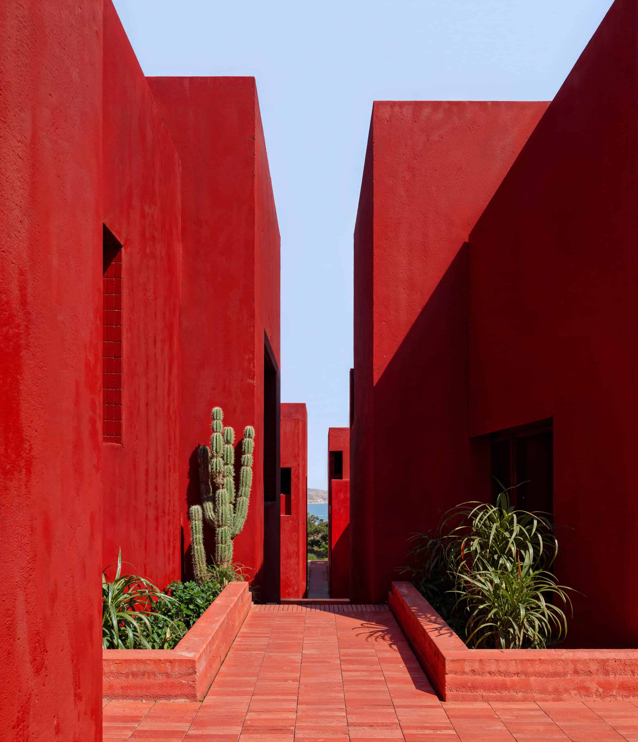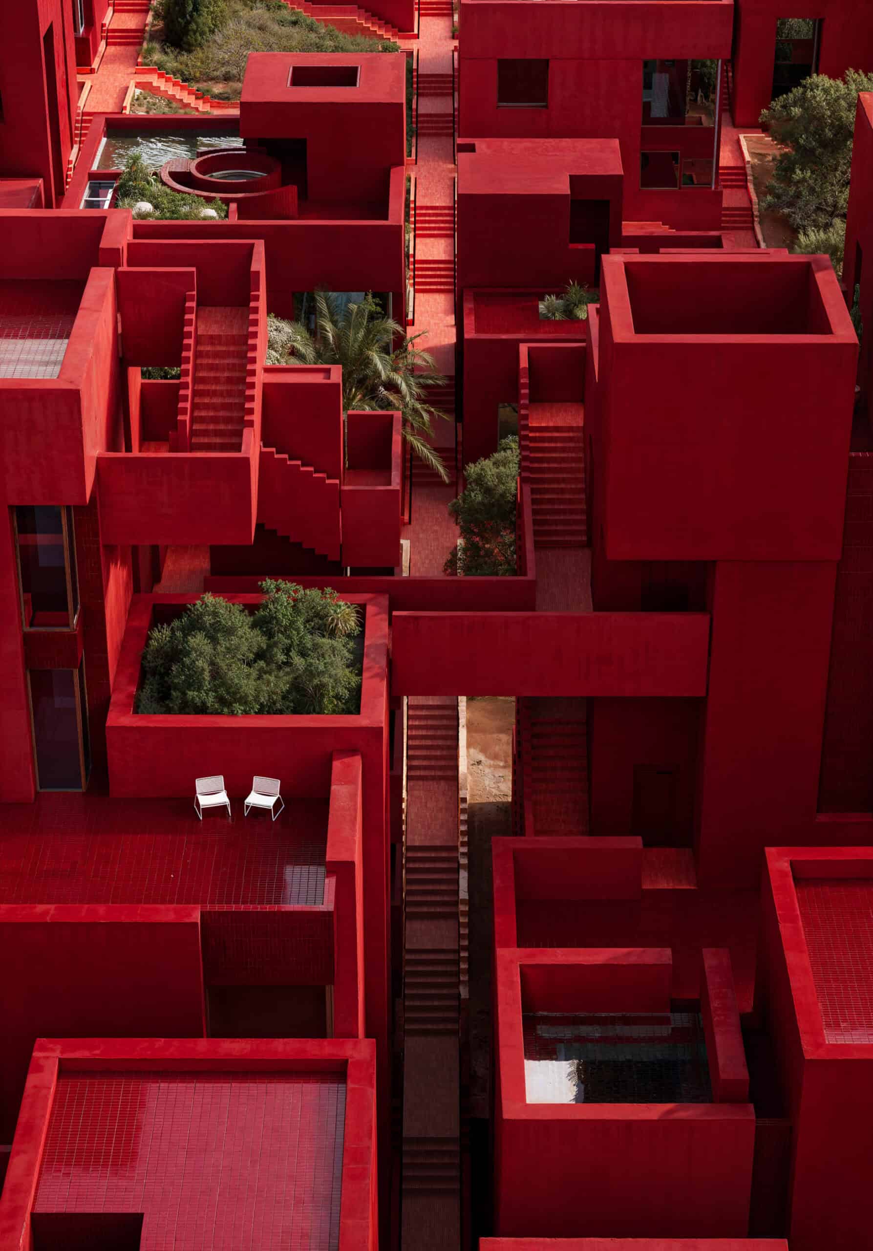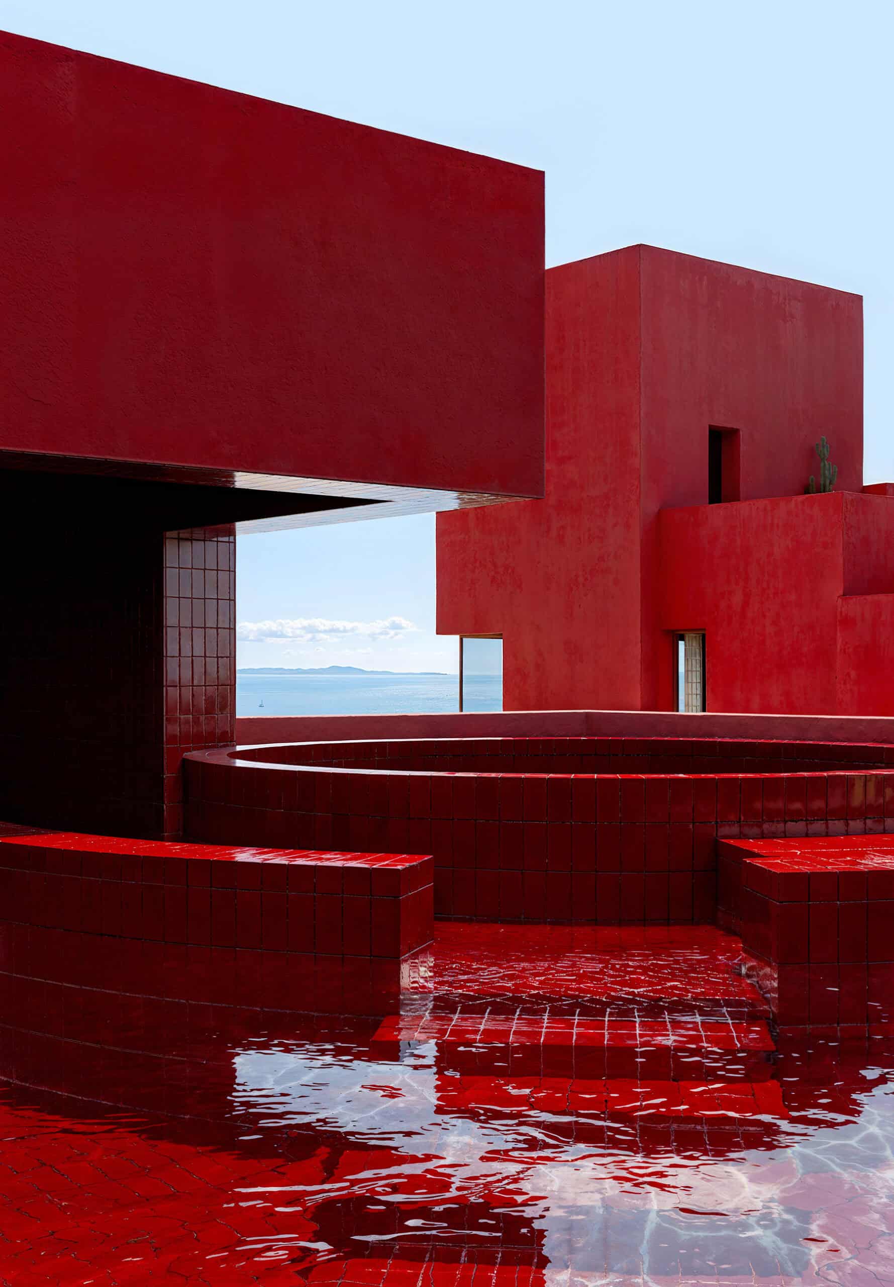 This ethos of spatial interconnection and communal living is reinterpreted at Red Sol Resort. The villas are linked through a web of outdoor staircases, bridges, and walkways that produce a castellated silhouette across the hillside. These elevated routes traverse circular pools, shared patios, and scenic lookouts. A grand central staircase descends the site axis toward the sea, culminating in a portal that frames the horizon—an architectural gesture that transforms the landscape into a dramatic procession.