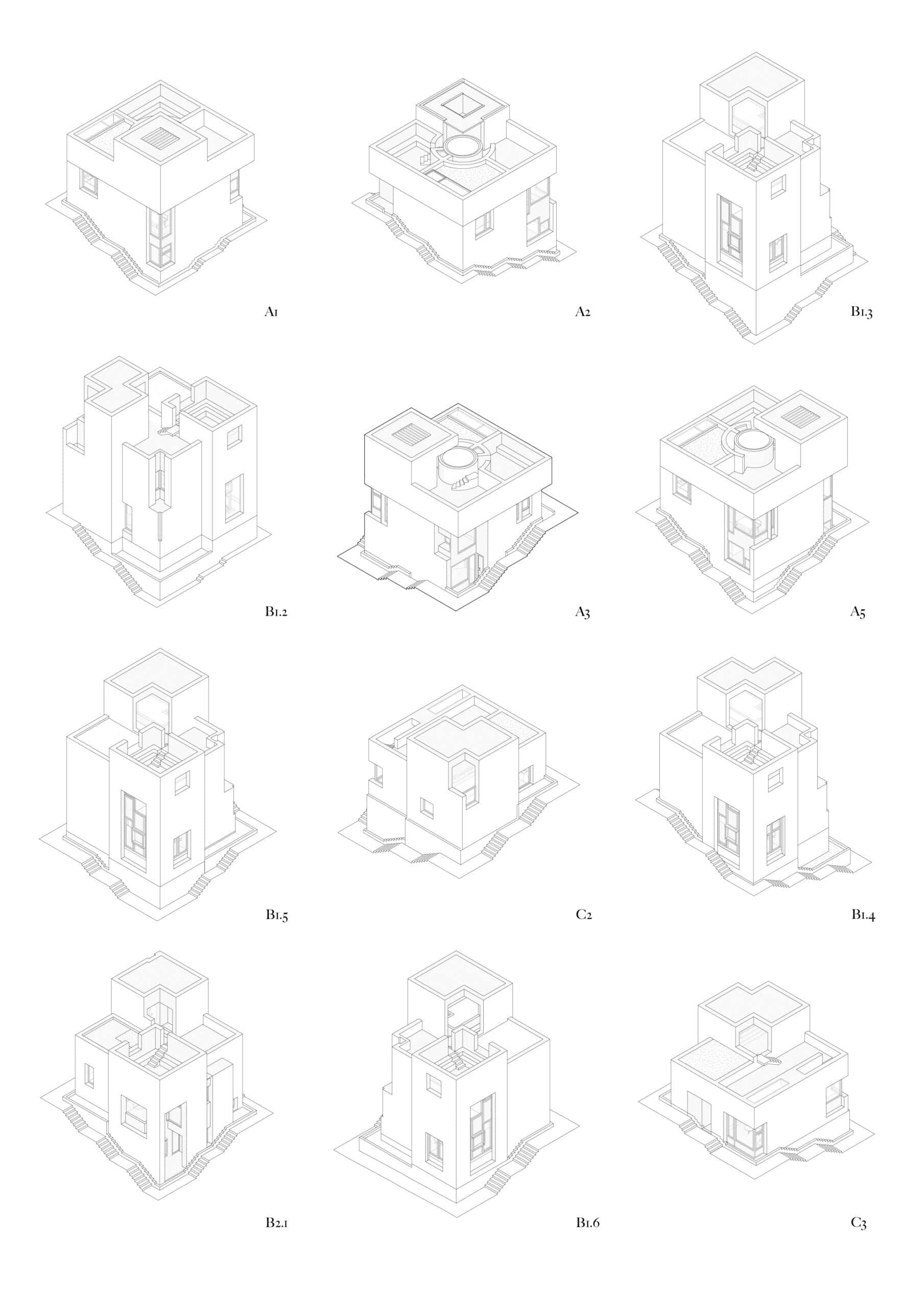 Each villa follows a modular system, composed of identical squares in plan. Pockets of untouched natural landscape are intentionally left between units, forming shared spaces for communal use. In section, the villas rise and shift along the terrain, extruding the grid upward to carve out interior spaces and open toward sea views. Their vertical arrangement echoes the mountainous rhythm of the site, while the use of locally resonant materials grounds the buildings in their context. At the lower level, units are inward-looking and private, each surrounding its own courtyard. In contrast, upper façades open generously to the environment, culminating in rooftop terraces complete with private pools.