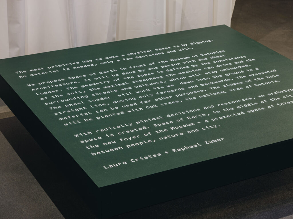 We propose creating a ‘Space of Earth’ in front of the Museum of Estonian Architecture using just one person and a wheel loader. The geometry of the space is defined by the consistency of the soil, the maximum incline the machine can handle, and the surrounding streets and walkways, which will remain undisturbed. The wheel loader will work its way down into the ground in a straight line, moving only forwards and backwards. The excavated soil can be repurposed for other uses. The slopes of the excavation will be planted with oak trees (Quercus robur), the national tree of Estonia.