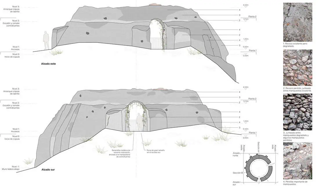 This project centered on the comprehensive restoration of two wells, with the primary goal of recovering their original geometry, resulting in two complete examples from a series of 28 wells. The restoration was carried out using traditional construction techniques and materials: namely, stone and brick masonry, accompanied by lime mortar. Before this intervention, there were no complete wells remaining in the Sierra Espuña that displayed the original structure; two previous restorations had used metal structures, diverging from traditional techniques.
