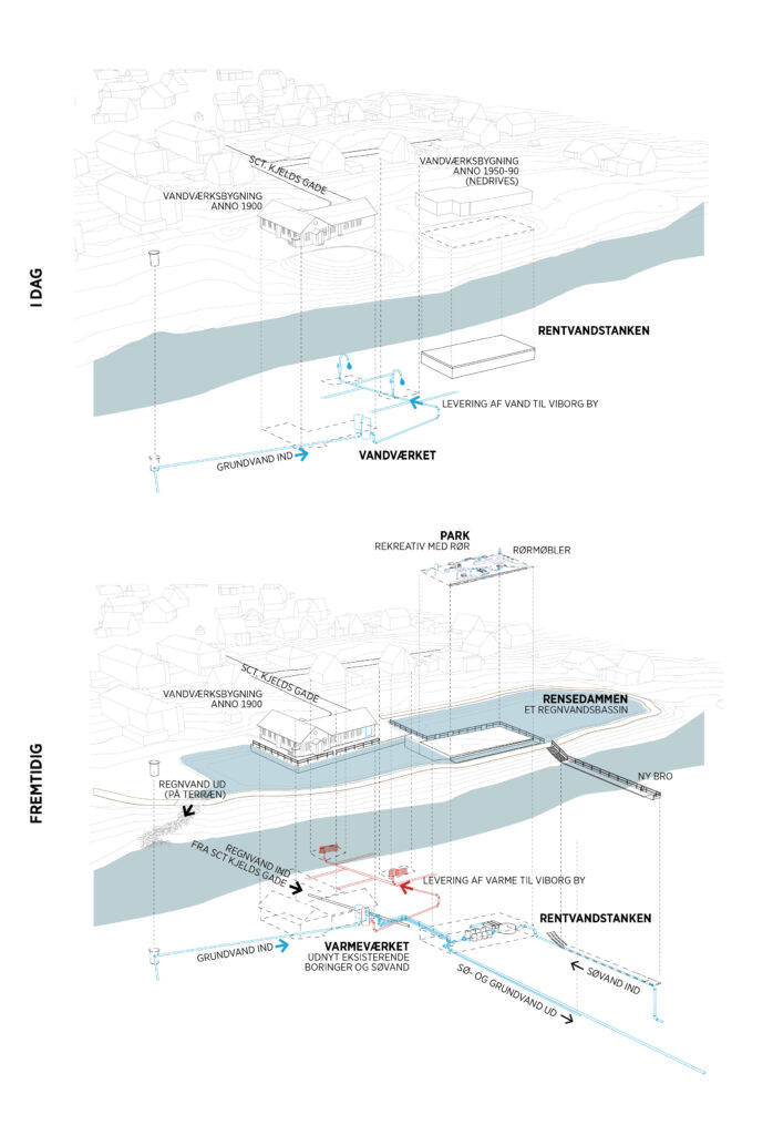 sØværket (The Lake Plant) conveys its own history through the preservation and (re)use of both the old water treatment building and a subsequent clean water tank. The waterworks building houses a heat pump system that supplies the area’s district heating consumers by extracting heat from the old wells.