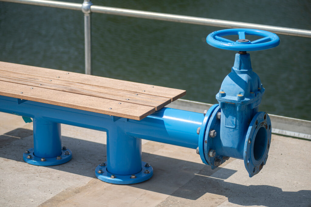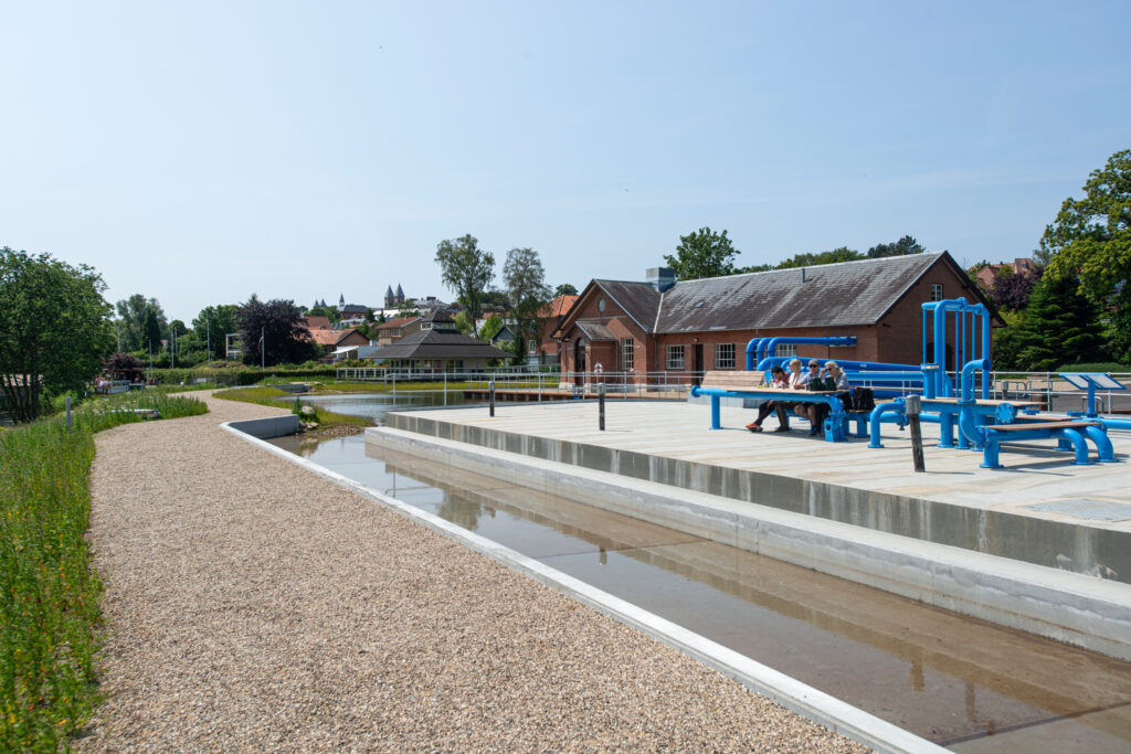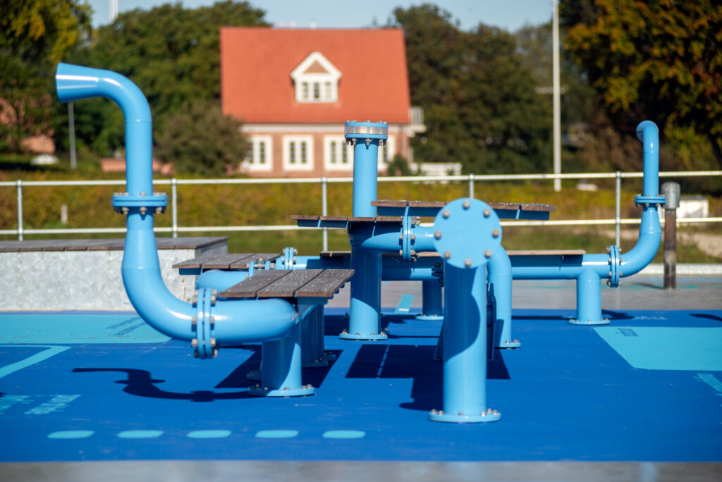 A phosphorus purification system has been installed in the clean water tank for use in heat production, while a play and recreation area has been created on top of the tank. Here one can experience both the area’s historical function as a water treatment plant and its new heat-producing and rainwater-handling functions. This is demonstrated through the use of water pipes in the design of tables and benches.