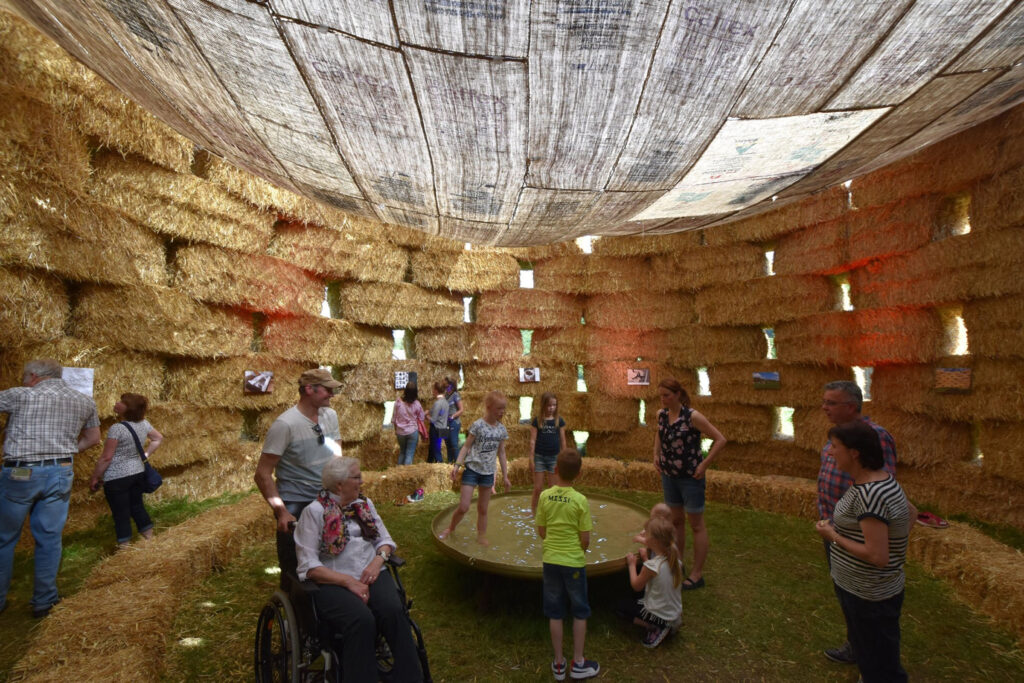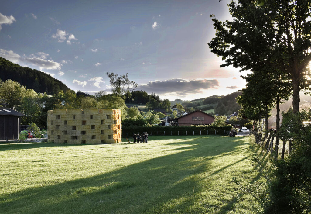 The Straw Thermae pavilion was conceived to commemorate Referinghausen’s transition toward energy autonomy. Installed during the village’s 750th anniversary in 2019, the project reflects a shift away from fossil fuel dependency through the implementation of a locally constructed heating network linked to a nearby biogas facility fueled by organic waste. This system has enabled a 50 percent reduction in energy costs while eliminating CO₂ emissions.