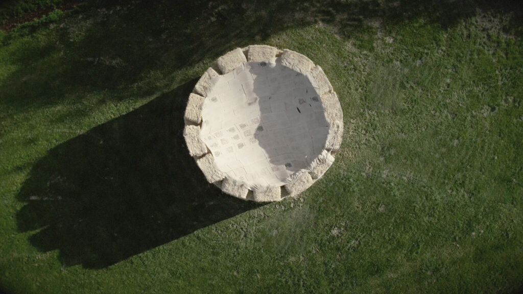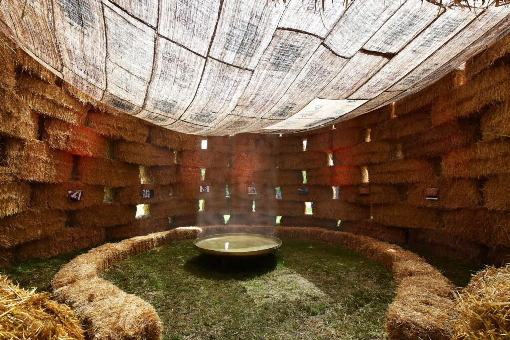 The pavilion is organized around a central steel basin containing heated water, representing the locally generated energy that sustains the community. This core is encircled by straw, referencing the biomass processes underpinning the system. Beyond its symbolic configuration, the pavilion functioned as a public forum, hosting discussions and exchanges on renewable energy strategies and their potential replication in other contexts.