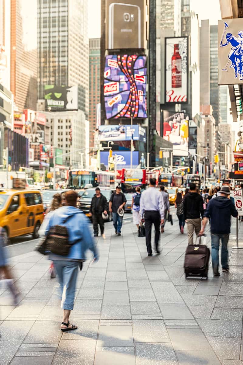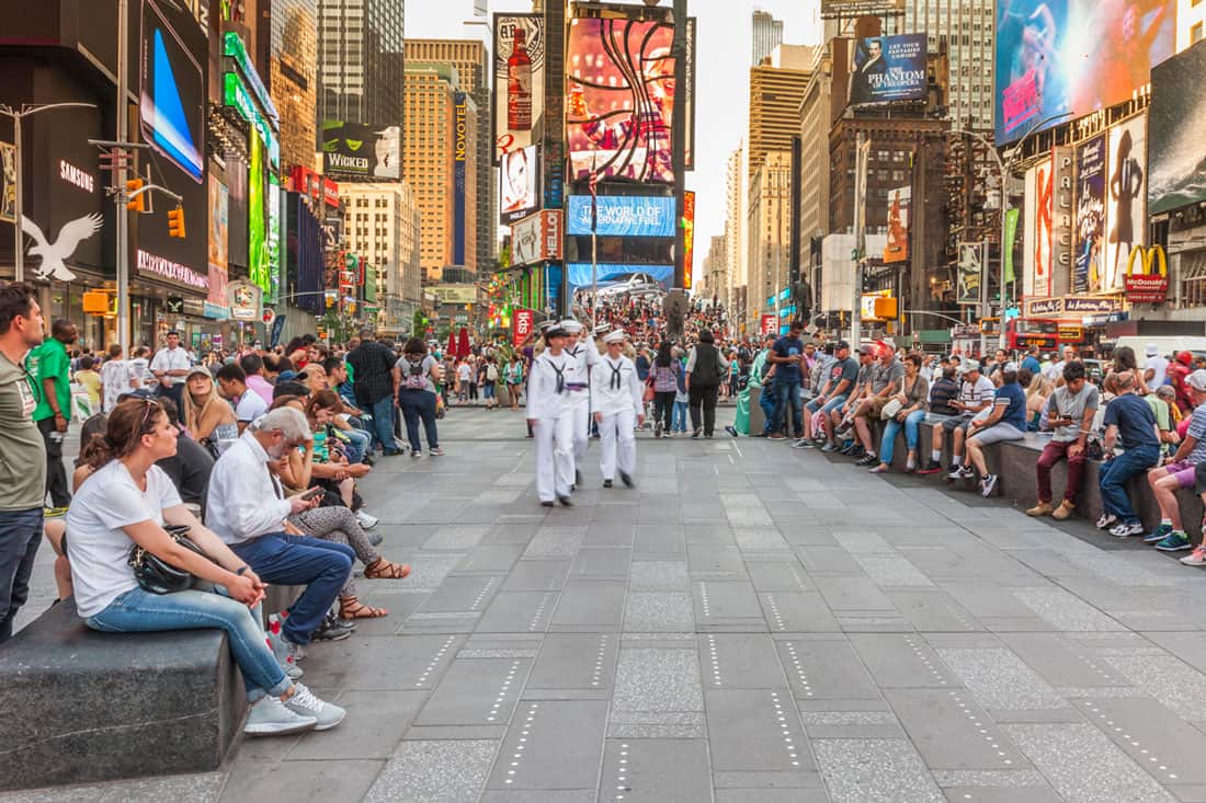 Over 40 million people visit or pass through Times Square each year. The site is known as the ‘Bowtie’; its physical boundaries are Broadway and 7th Avenue between 42nd and 47th Streets. Facing extreme traffic and pedestrian volumes and safety concerns, the project began with the NYC Department of Transportation’s “Green Light for Midtown” safety and mobility project in 2009, which used temporary paving and street furniture to close Broadway to vehicular traffic between 42nd and 47th streets in order to alleviate congestion. Prior to the street closure, Broadway’s diagonal slant across Manhattan’s grid created an irregular, multi-legged intersection where Broadway meets the north-south running 7th Avenue. This difficult pinch point posed a hazard to pedestrians and car traffic resulting in narrow, overcrowded sidewalks that forced pedestrians to spill into the roadways, leading to 137% more pedestrian crashes in Times Square than on other avenues in the area. The temporary closures and pedestrian-only public spaces were hugely successful, easing congestion and helping make the streets safer for everyone using them. In 2010, following the success of the pedestrian-only public spaces, the New York City Department of Design and Construction and the New York City Department of Transportation selected architecture and landscape architecture firm Snøhetta to lead the design of the new permanent plaza in Times Square.