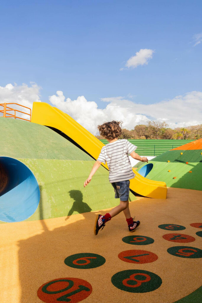Set at the entrance of the BoaVista Palhano condominium in Brazil, this small-scale recreational intervention redefines the playground as a landscape for collective play. Occupying a garden shaped by the curvature of the road and the site’s natural slope, the project draws from the sail-like geometry of the plot to establish both its spatial logic and its playful identity.