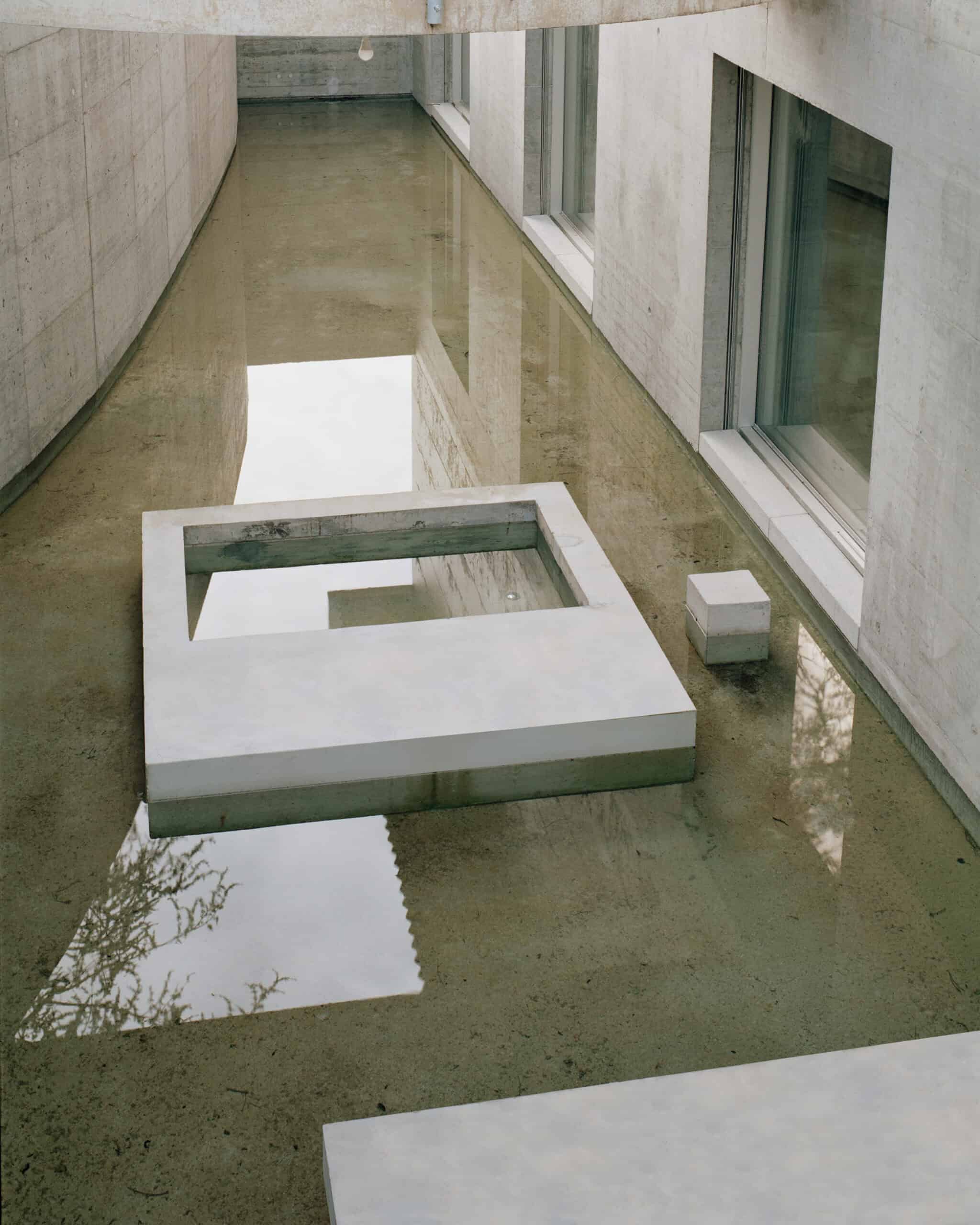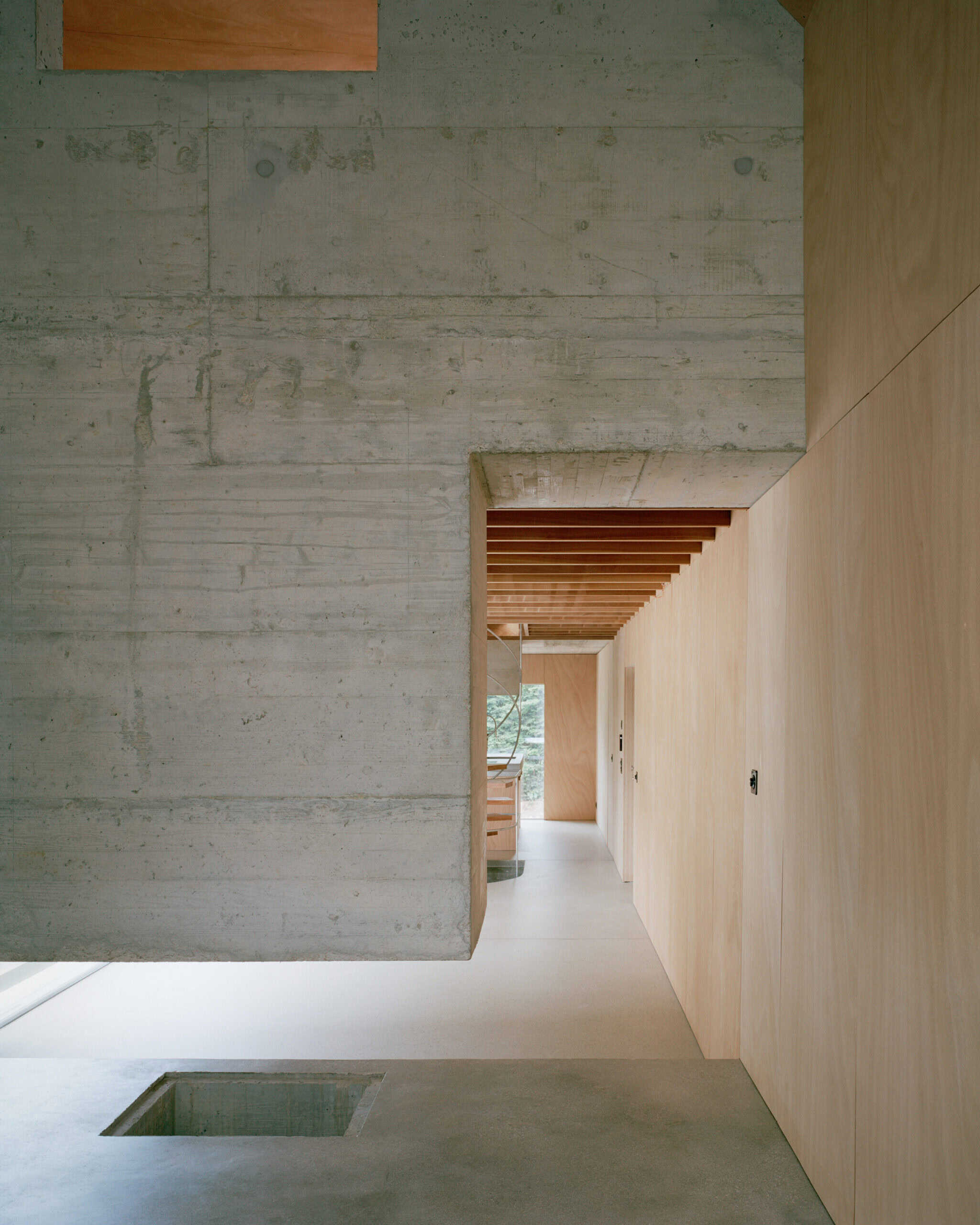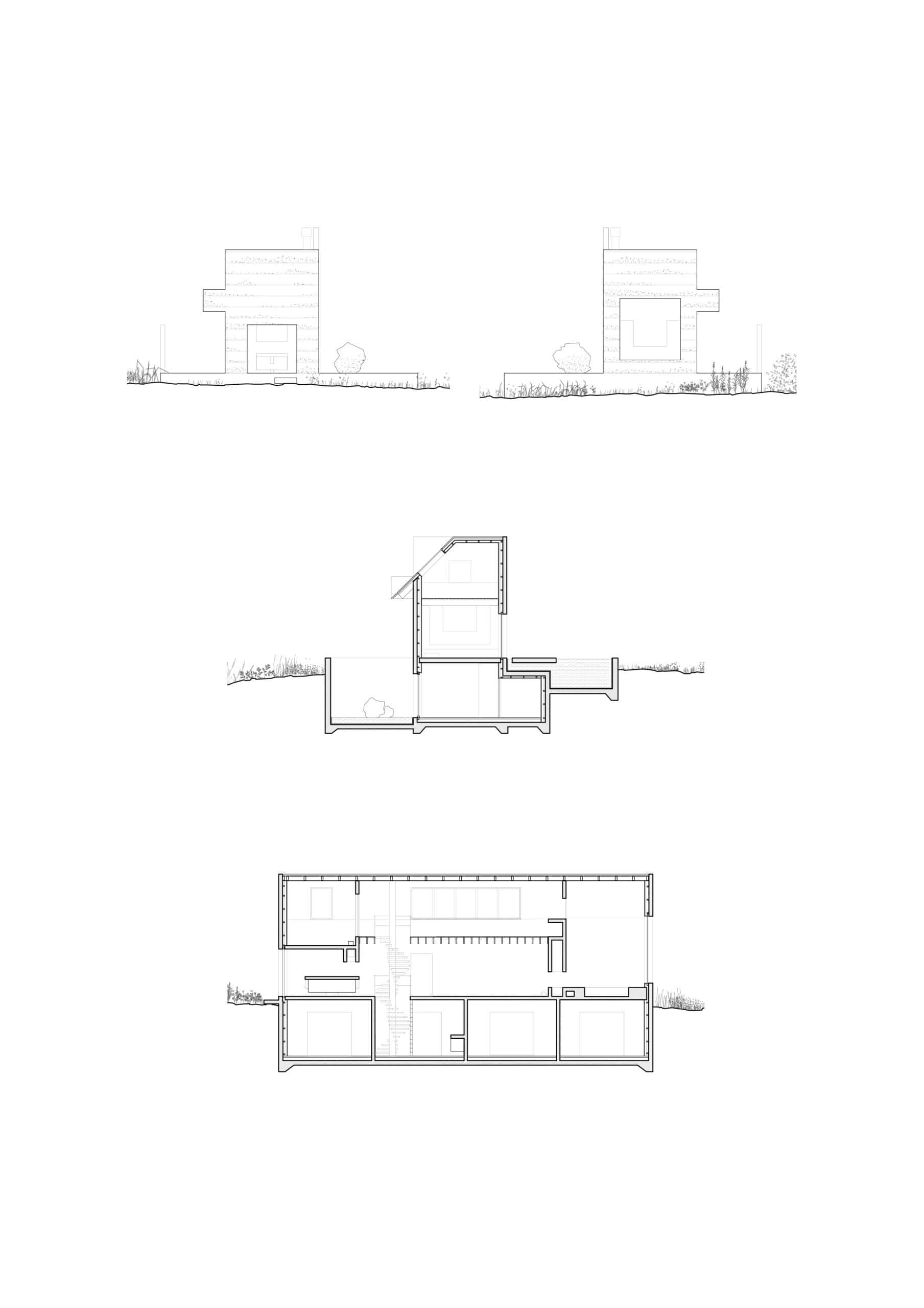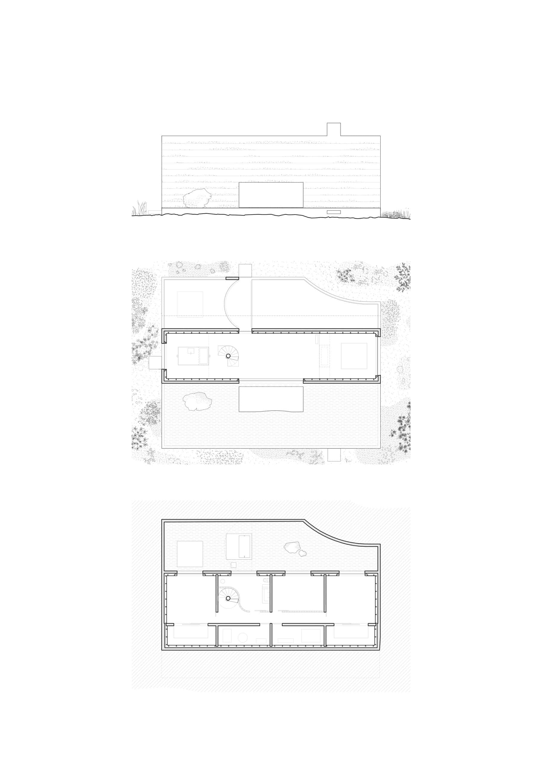 The long rectangular plan, highly constrained by building regulations, develops on three levels. While the ground floor living spaces largely open out to the surroundings, the underground bedrooms open to an enclosed, inaccessible patio, filled with a thin layer of rainwater collected from the roof. The light bounces off the two basins before entering the house, projecting its dancing reflections onto the wooden walls and ceiling.