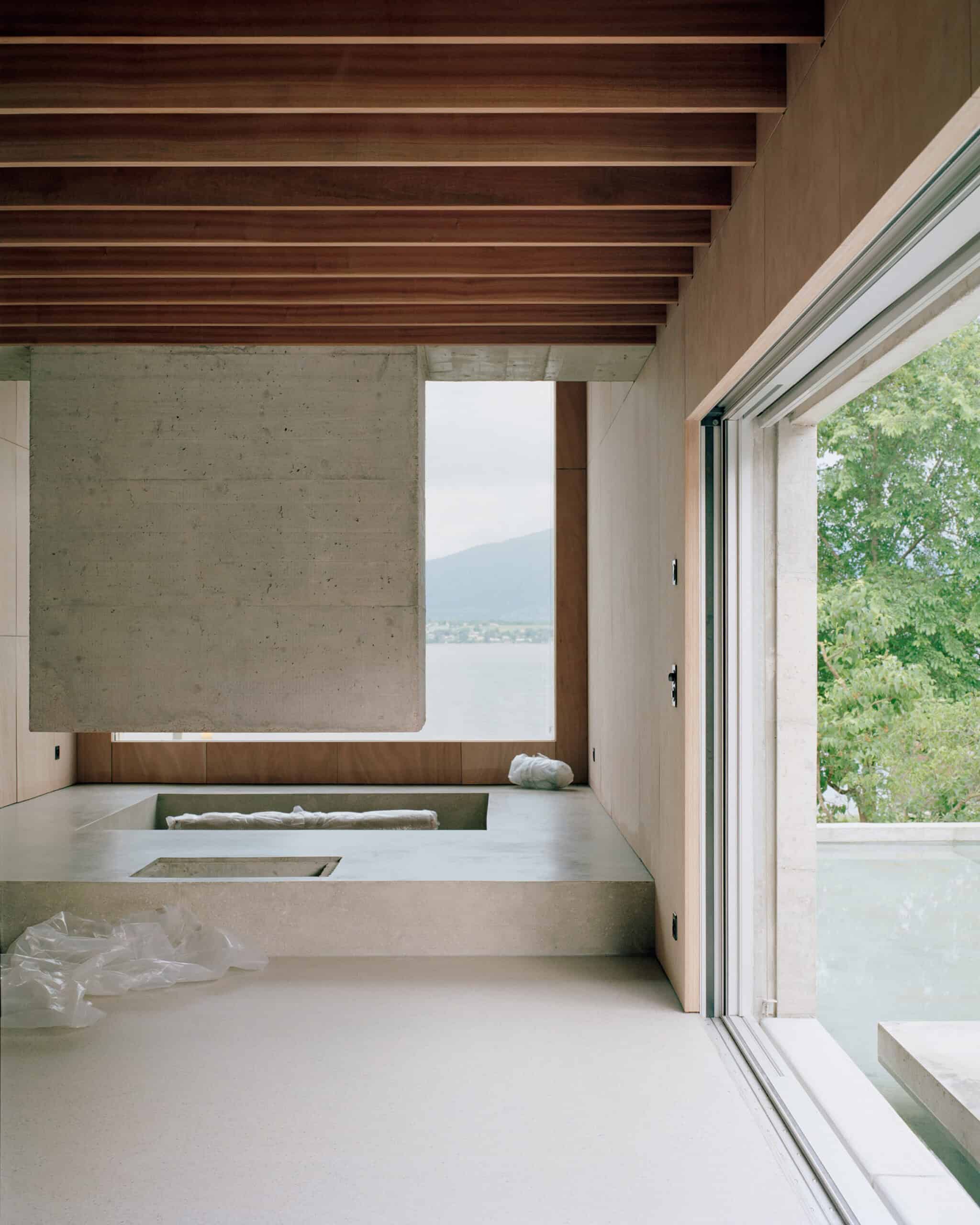 Ferdinand Hodler painted mountains reflected in Swiss lakes, again and again. He was obsessed with this double inverted landscape, constantly evolving with the changing sky and the movement created by the wind blowing on the water’s surface. In 1867, aged 14, he painted his first lakes and sold them to passing tourists. In 1918, fifty years later, he died in Geneva, leaving behind a few unfinished sketches of Mont-Blanc reflected in Lake Geneva, as seen from his apartment balcony. Villa Montasser sits beside the beautiful Lake Geneva, looking out at the Alps. As a reaction to the majestic landscape, the building tries to stay as simple and humble as possible. The long, plain façade is a blank canvas reflecting into a water basin of the same length. A singular long window opens onto a floating terrace, again of similar dimensions. The reflection of the chimney becomes the stairs, leading to the pool. An erratic block, carried by the ancient glaciers from the alps to the lake shore, sits upon the water surface. The main façade is a symetrcal reflection, a tribute to the horizontal line separating the looming mountains and reflective lake in Hodler’s work.