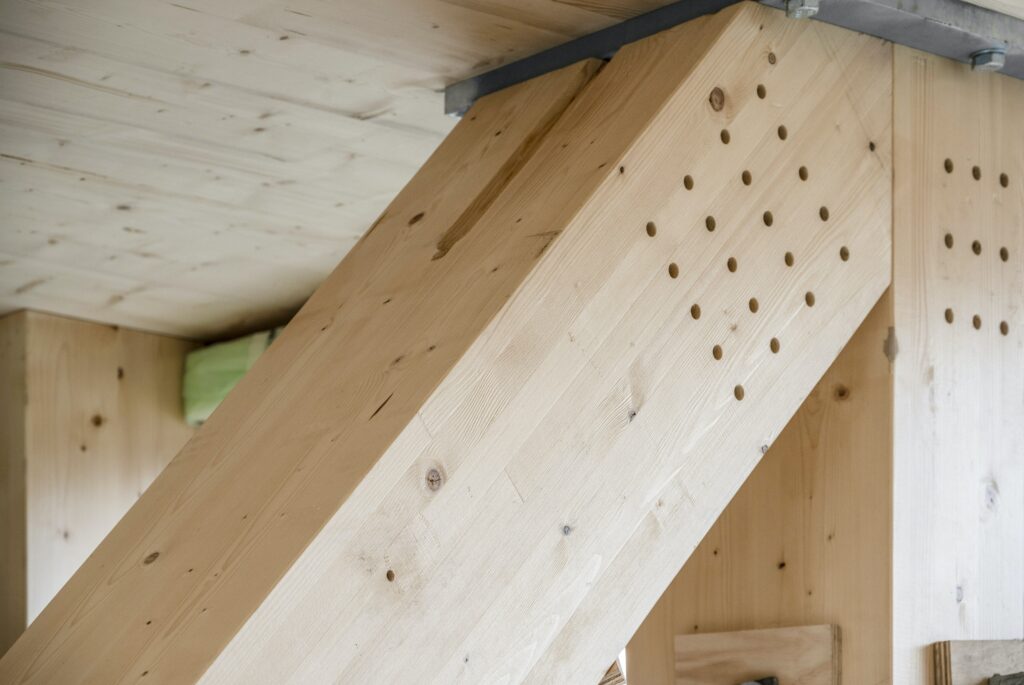 With its 31,000 m² solid timber structure, the project reduces lifetime CO₂ emissions by 5,400 tonnes compared to a conventional build and is seen as a national flagship in documented low‑carbon public architecture. Visible glulam columns and partially exposed CLT floor structures serve as recurring load‑bearing elements, delivering both technical performance and sensory quality while storing carbon.